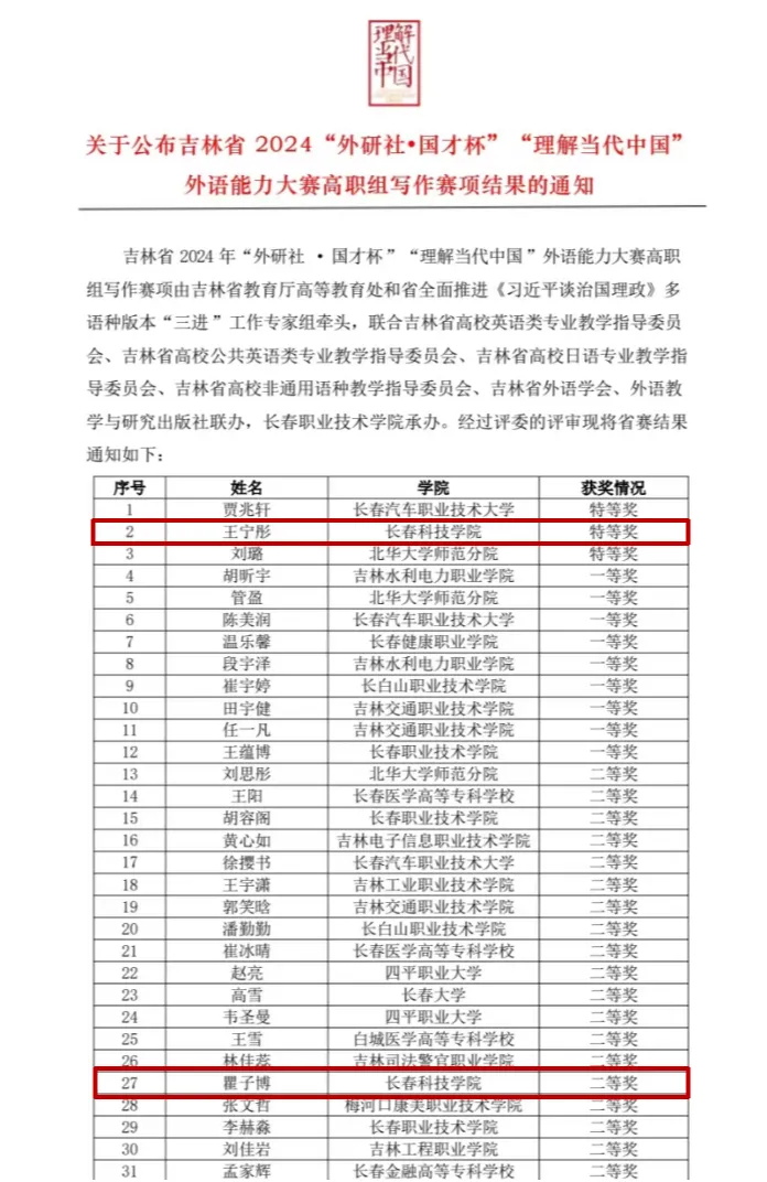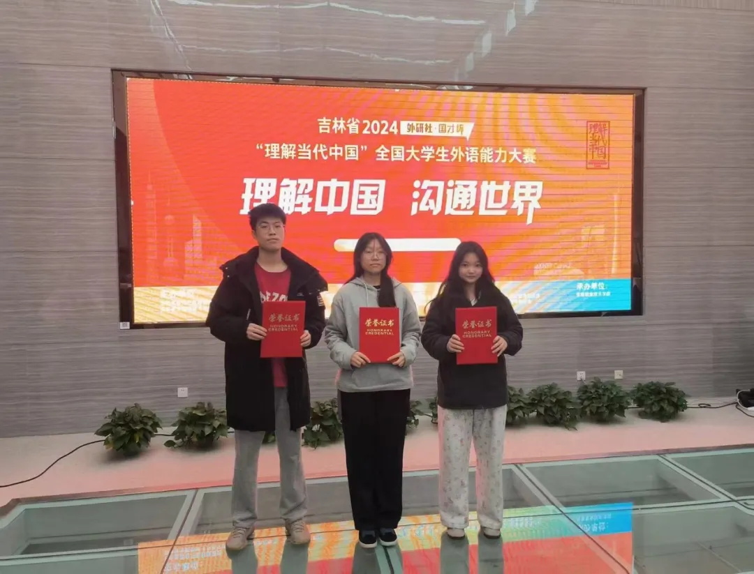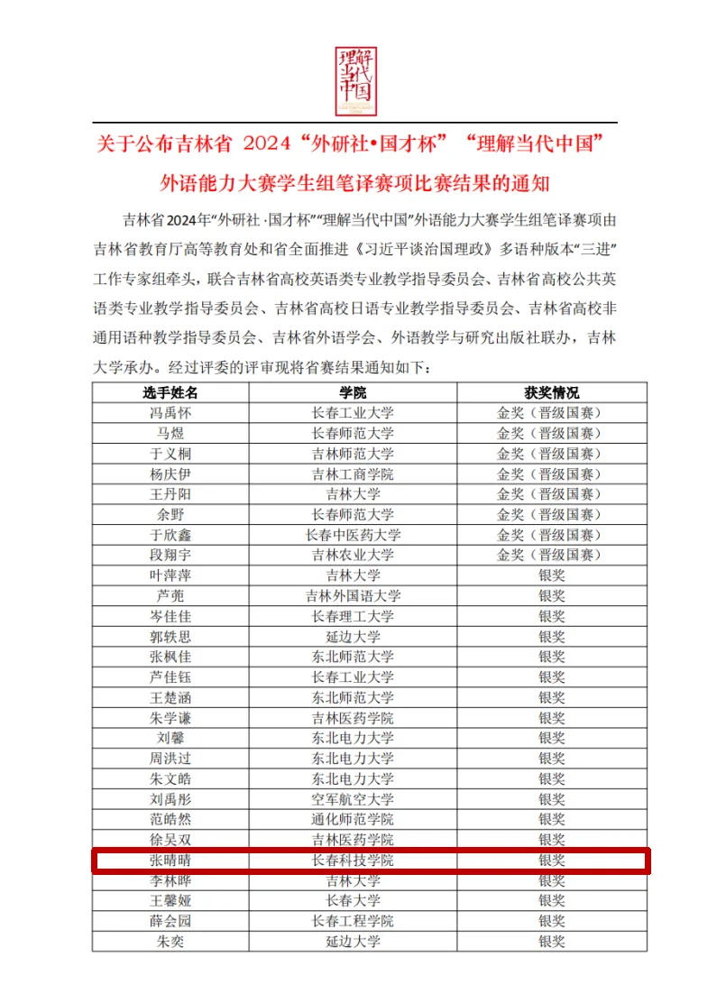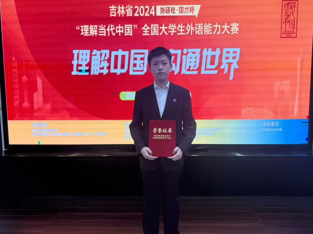 近日,由吉林省教育厅高等教育处和省全面推进《习近平谈治国理政》多语种版本“三进”工作专家组牵头,由吉林大学承办的吉林省 2024“外研社•国才杯”“理解当代中国”外语能力大赛学生组笔译赛项、综合能力赛项中、高职组英语写作赛项、高职组英语演讲赛项圆满结束,我校学生积极参与此次比赛。