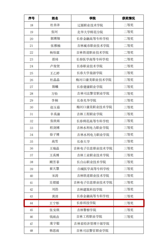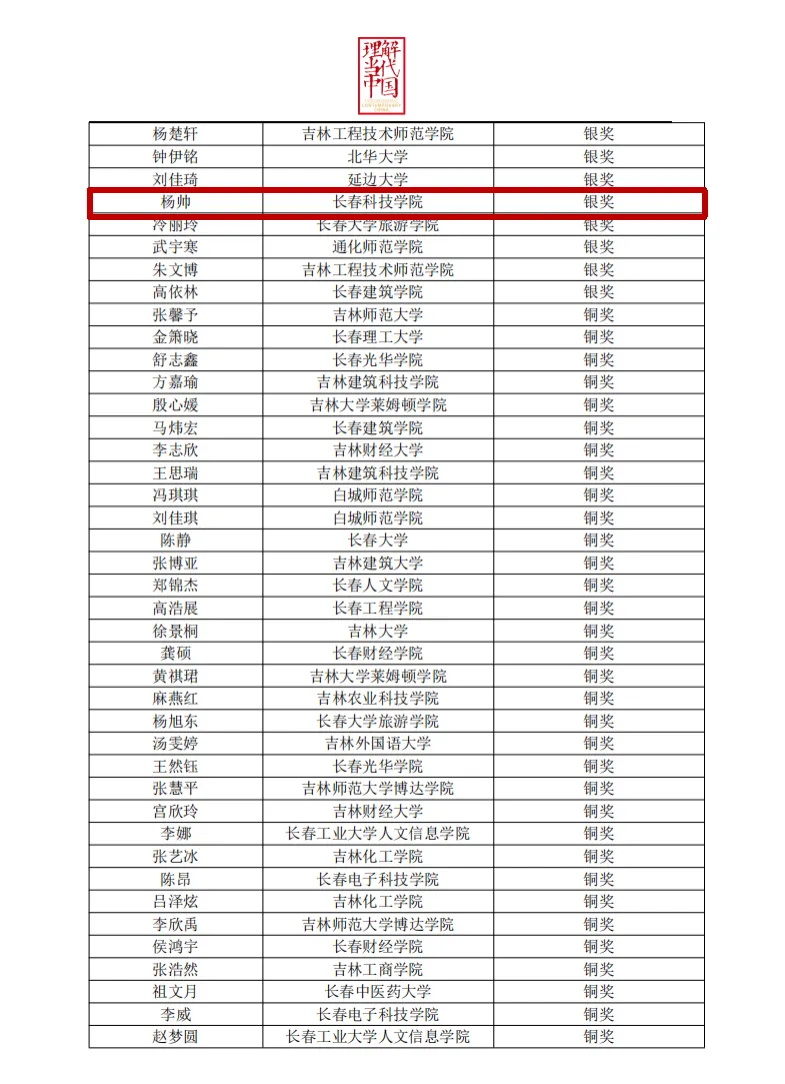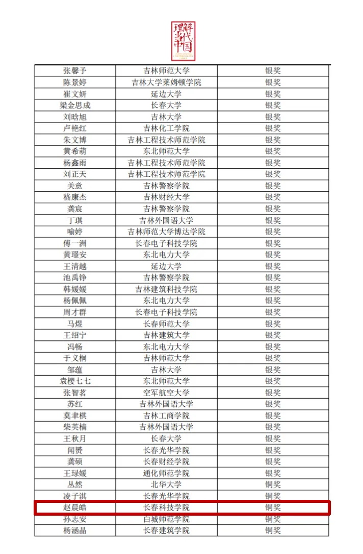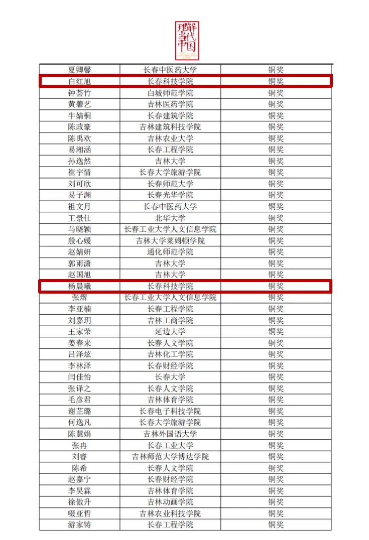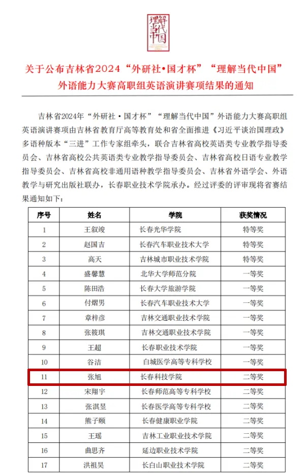 近日,由吉林省教育厅高等教育处和省全面推进《习近平谈治国理政》多语种版本“三进”工作专家组牵头,由吉林大学承办的吉林省 2024“外研社•国才杯”“理解当代中国”外语能力大赛学生组笔译赛项、综合能力赛项中、高职组英语写作赛项、高职组英语演讲赛项圆满结束,我校学生积极参与此次比赛。