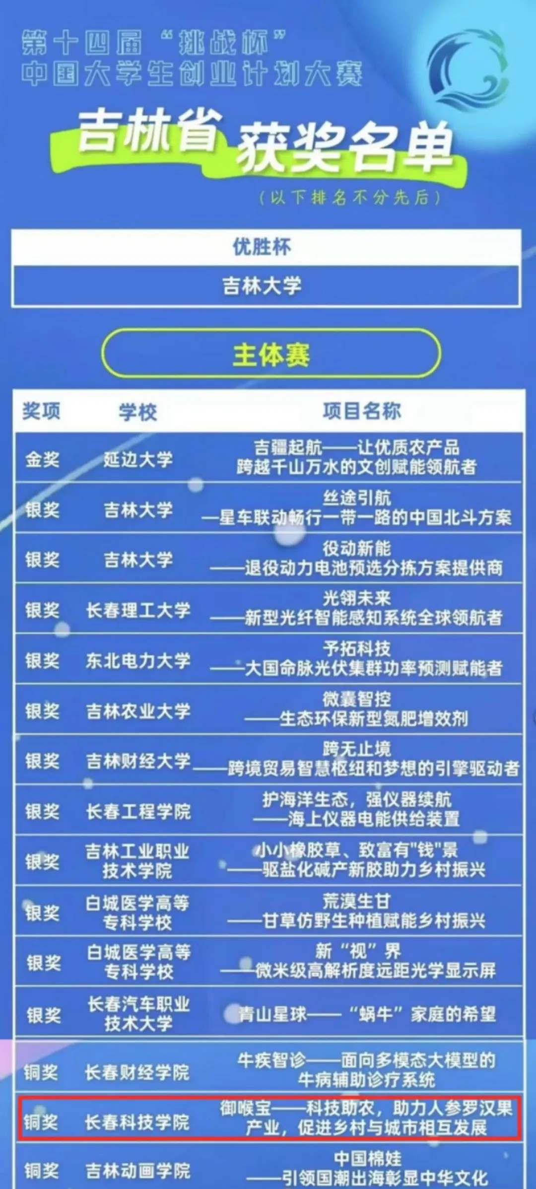 11月2日,由共青团中央、教育部、人力资源社会保障部、中国科协、全国学联主办的第十四届“挑战杯”中国大学生创业计划竞赛终审决赛在西安圆满落幕。我校《御喉宝--科技助农,助力人参罗汉果产业,促进乡村与城市相互发展》项目荣获本届大赛主体赛铜奖1项,取得我校在“挑战杯”赛事上的历史性突破,首次摘得国家级奖项,为学校大学生科创赛事再创佳绩!