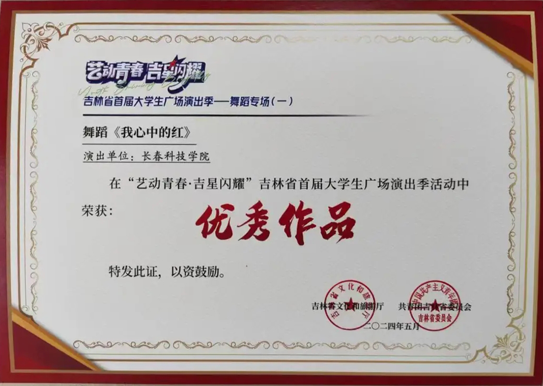 近日,“艺动青春,吉星闪耀”吉林省首届大学生广场演出季评奖结果公布,长春科技学院荣获优秀组织单位,其中民族舞《春意》,现代舞《我心中的红》均荣获优秀作品奖。
