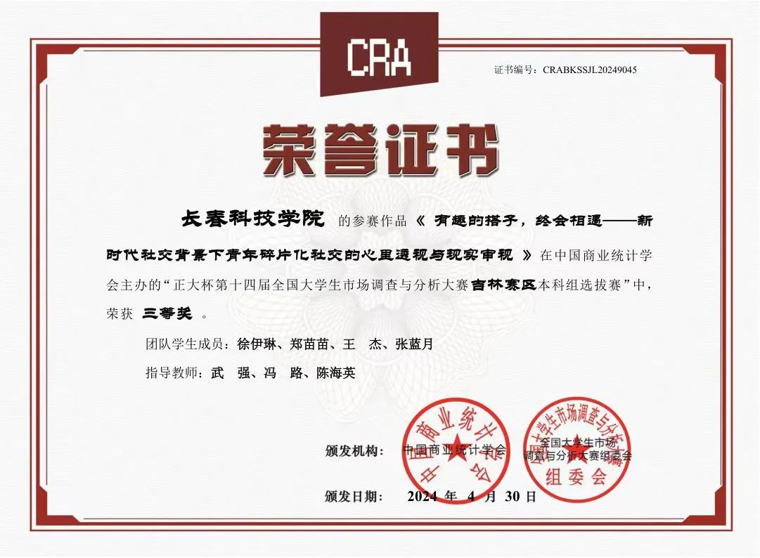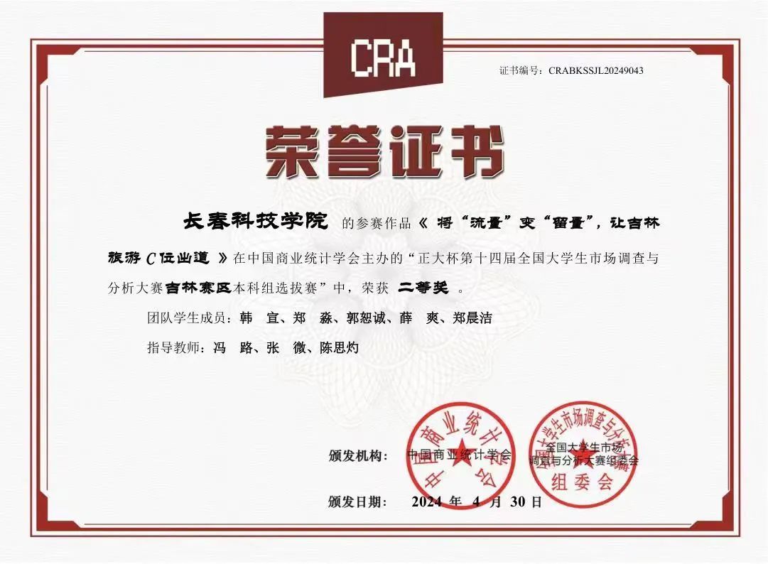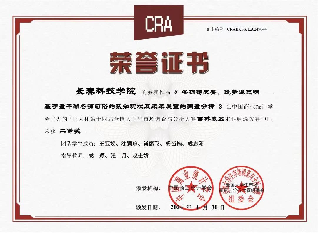 4月27日,由中国商业统计学会主办的“正大杯”第十四届全国大学生市场调查与分析大赛本科组吉林赛区选拔赛于在吉林财经大学成功举行。在老师的悉心指导下,我校学子克服重重困难,斩获多项奖项,最终获得第十四届全国大学生市场调研与分析大赛省赛二等奖两项,三等奖一项。