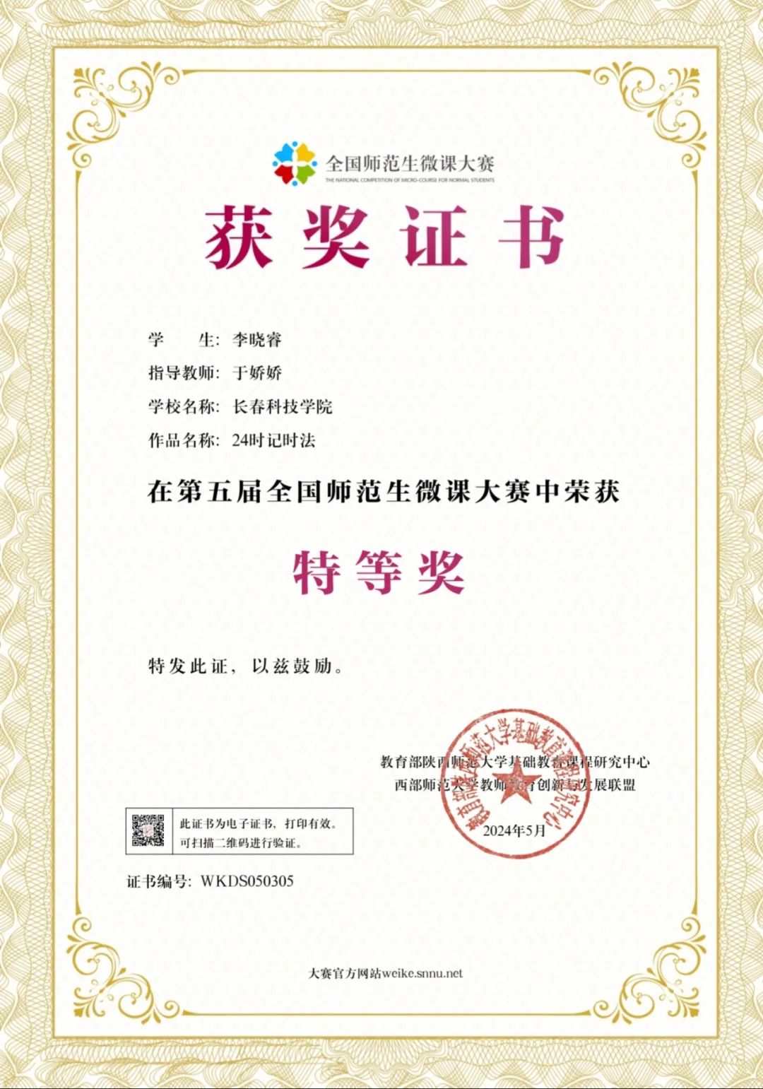 经过激烈的竞争,2022级小学教育5班李晓睿凭借出色的表现荣获大赛特等奖,学院教师于娇娇荣获“优秀指导教师”称号。语言文化学院·新媒体学院小学教育专业在此次大赛中位居全国院校前列,得到了同行院校的广泛认可,同时我校长春科技学院也被评为了优秀组织单位。