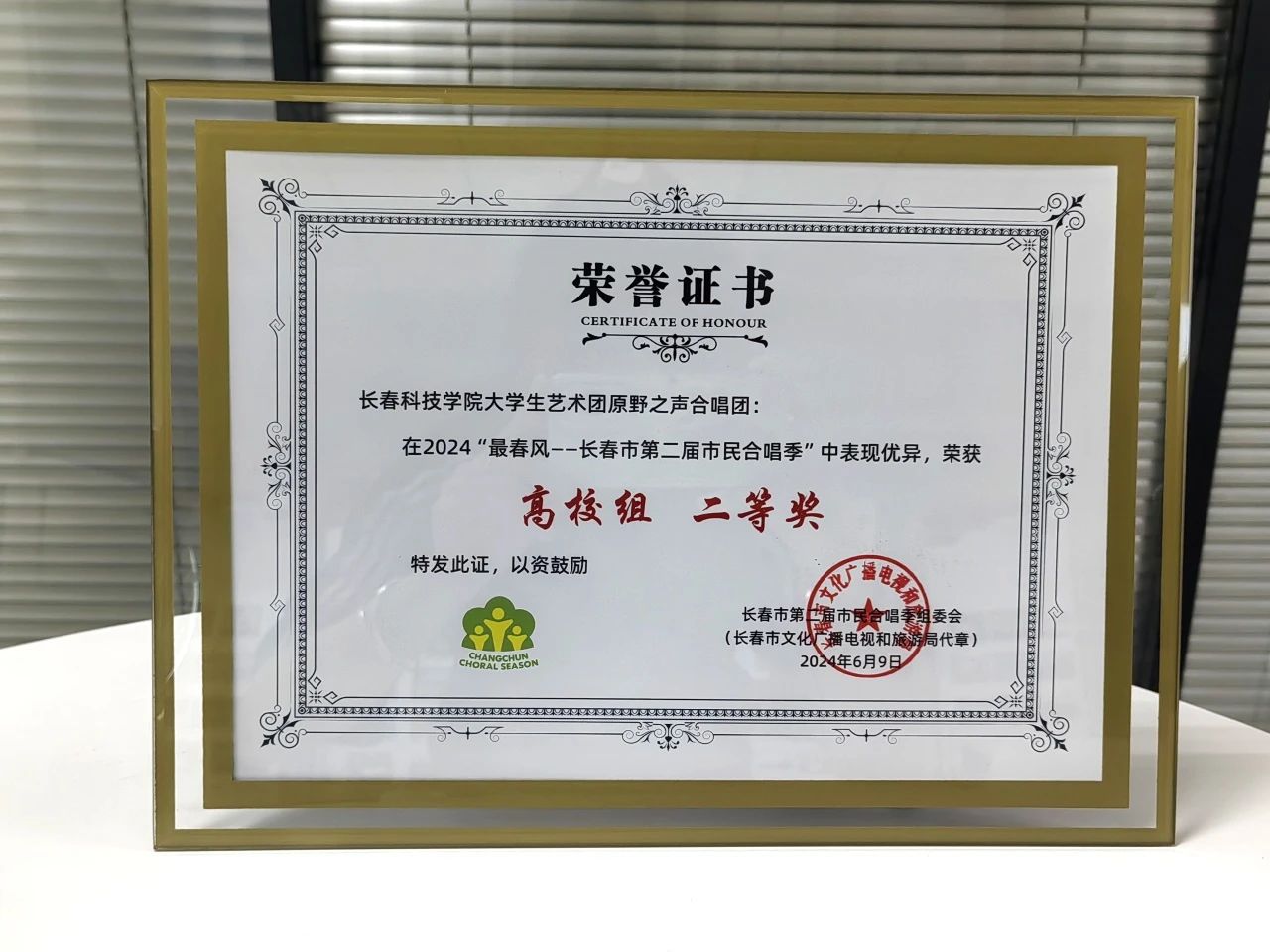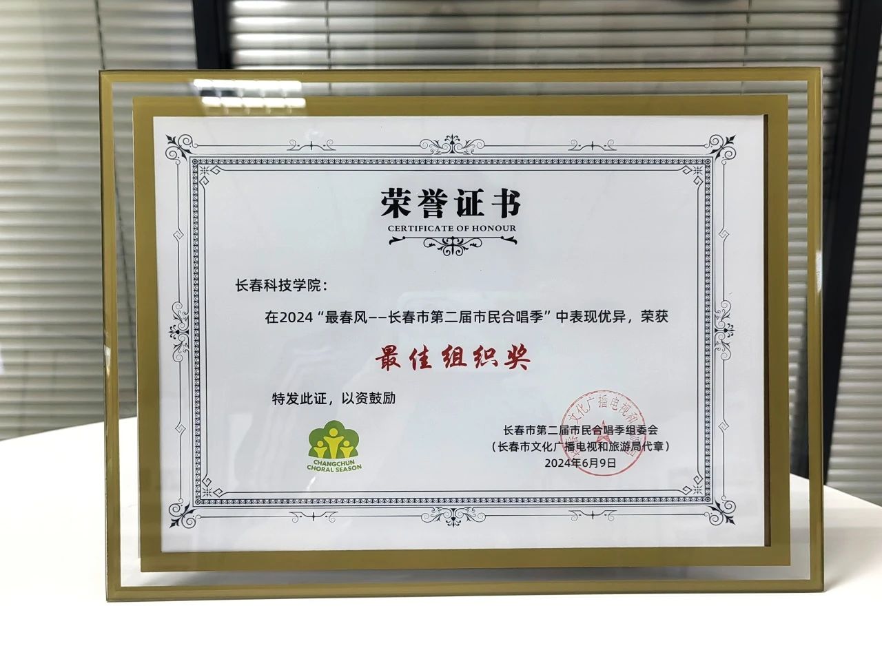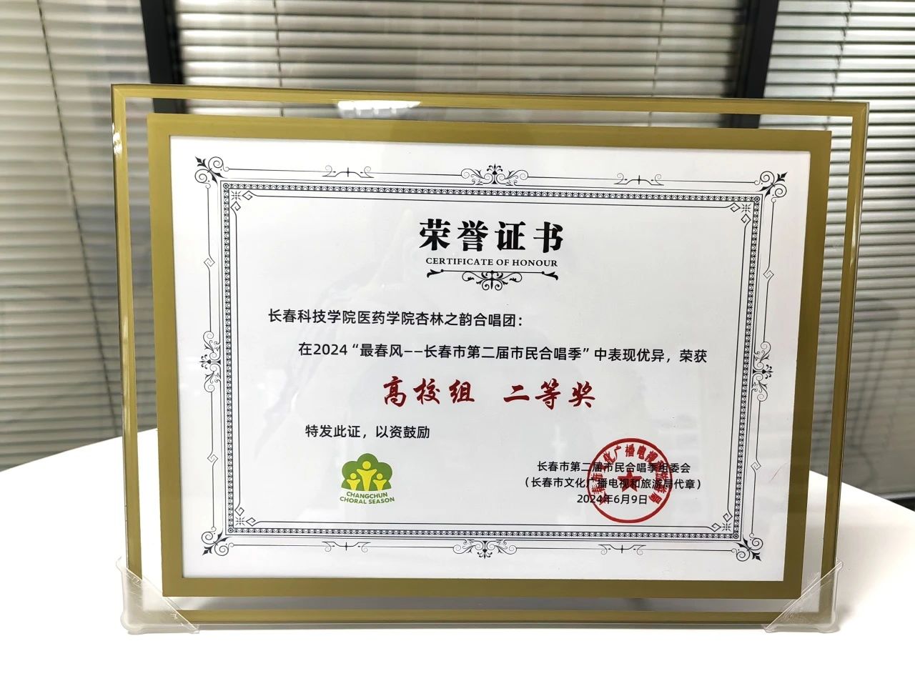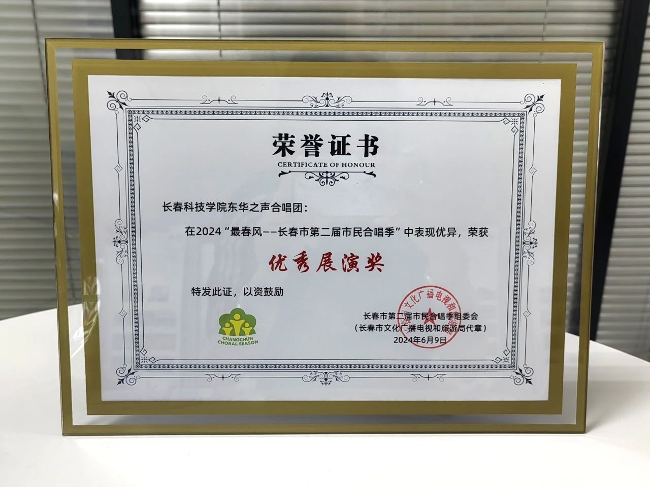 为了深入贯彻党的二十大精神,发挥文艺引领作用,打造美育特色,营造校园美育氛围,推进学校文化服务品牌建设。2024年6月9日团委孙佳莹老师带领原野之声合唱团队,受邀参加“最春风长春市第二届市民合唱季”音乐盛典暨颁奖典礼。我校共获五项奖项:校团委荣获优秀组织奖;原野之声合唱团荣获高校组二等奖、最具潜力奖;医药学院杏林之韵合唱团荣获高校组二等奖;东华之声合唱团荣获优秀展演奖。