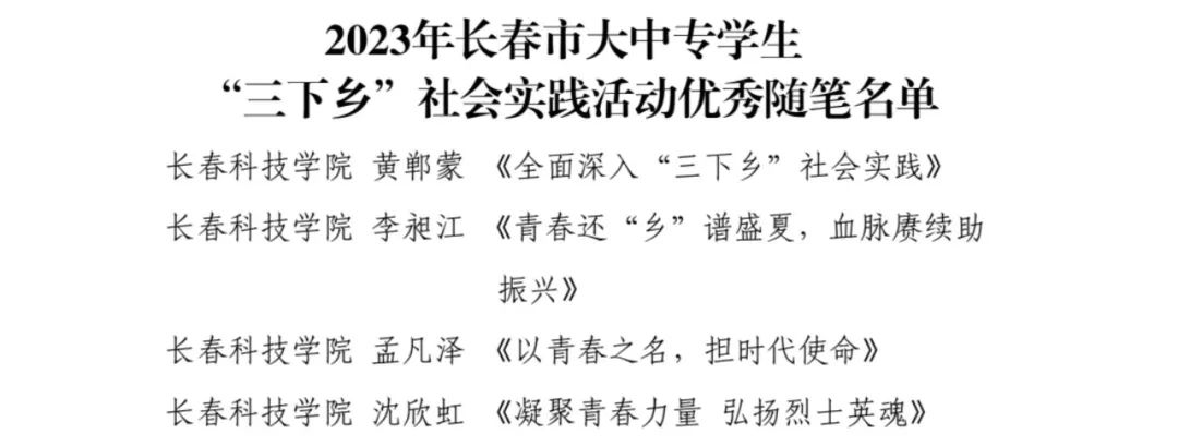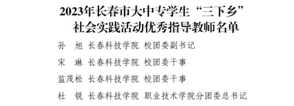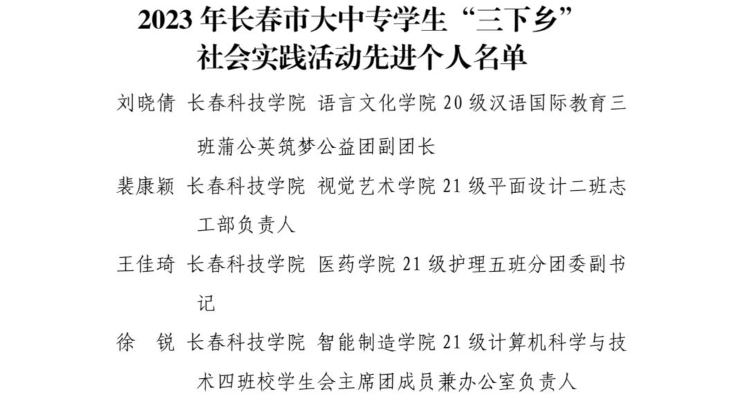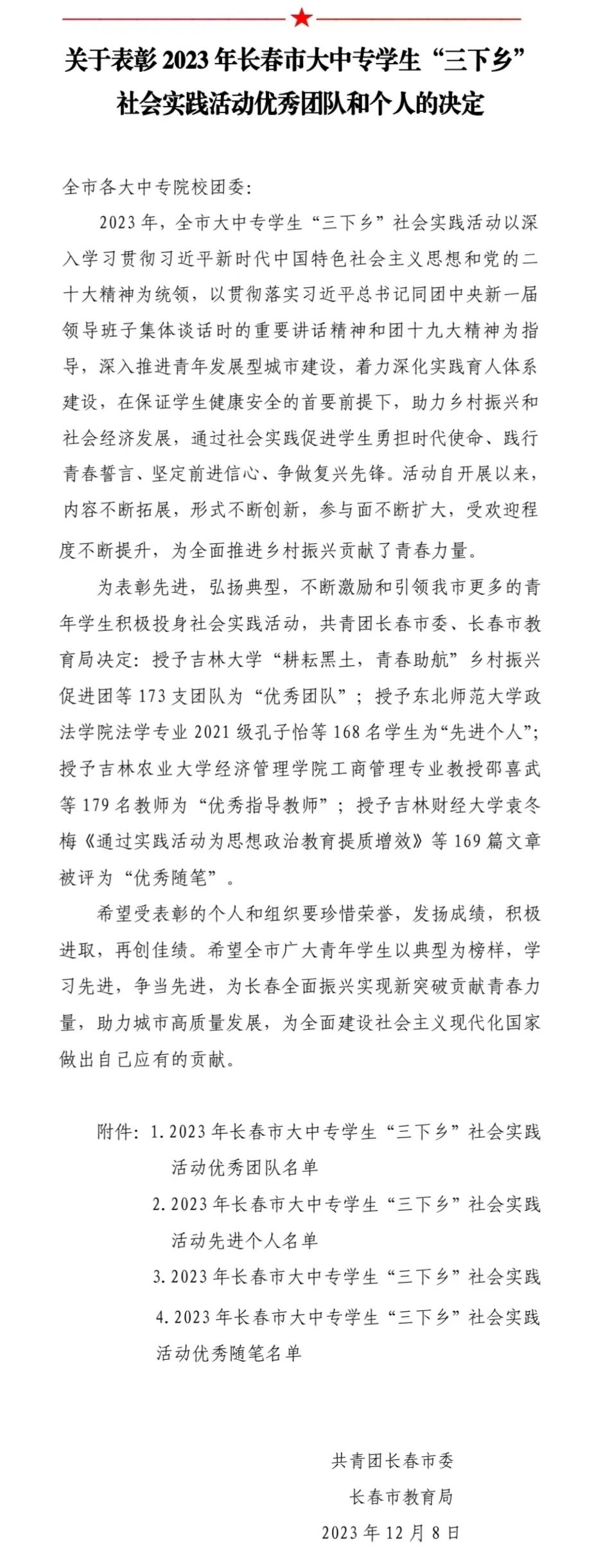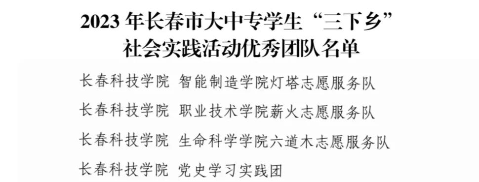近日,共青团长春市委员会、长春市教育局发布《关于表彰2023年长春市大中专学生“三下乡”社会实践活动优秀团队和个人的决定》。在此次表彰中,我校获得多项荣誉。