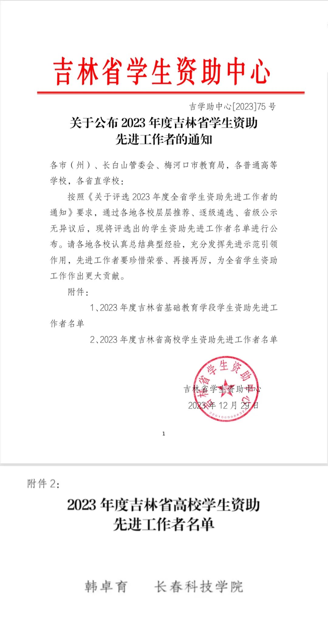近日,吉林省学生资助中心发布《关于公布2023年度吉林省学生资助先进工作者的通知》(吉学助中心[2023]75号),我校韩卓育老师获评“2023年度吉林省高校学生资助先进工作者”。