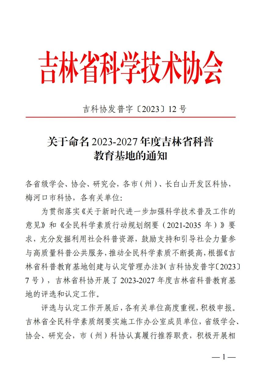 据了解,此次科普教育基地命名根据《吉林省科普教育基地创建与认定管理办法》(吉科协发普字〔2023〕7 号)文件评选认定,吉林省科协组织开展,旨在贯彻落实《关于新时代进一步加强科学技术普及工作的意见》和《全民科学素质行动规划纲要(2021-2035 年)》要求,充分发掘利用社会科普资源,鼓励支持和引导社会力量参与高质量科普公共服务,推动全民科学素质不断提高。评选经过省科协初评,专家终评,面向社会公示等程序。