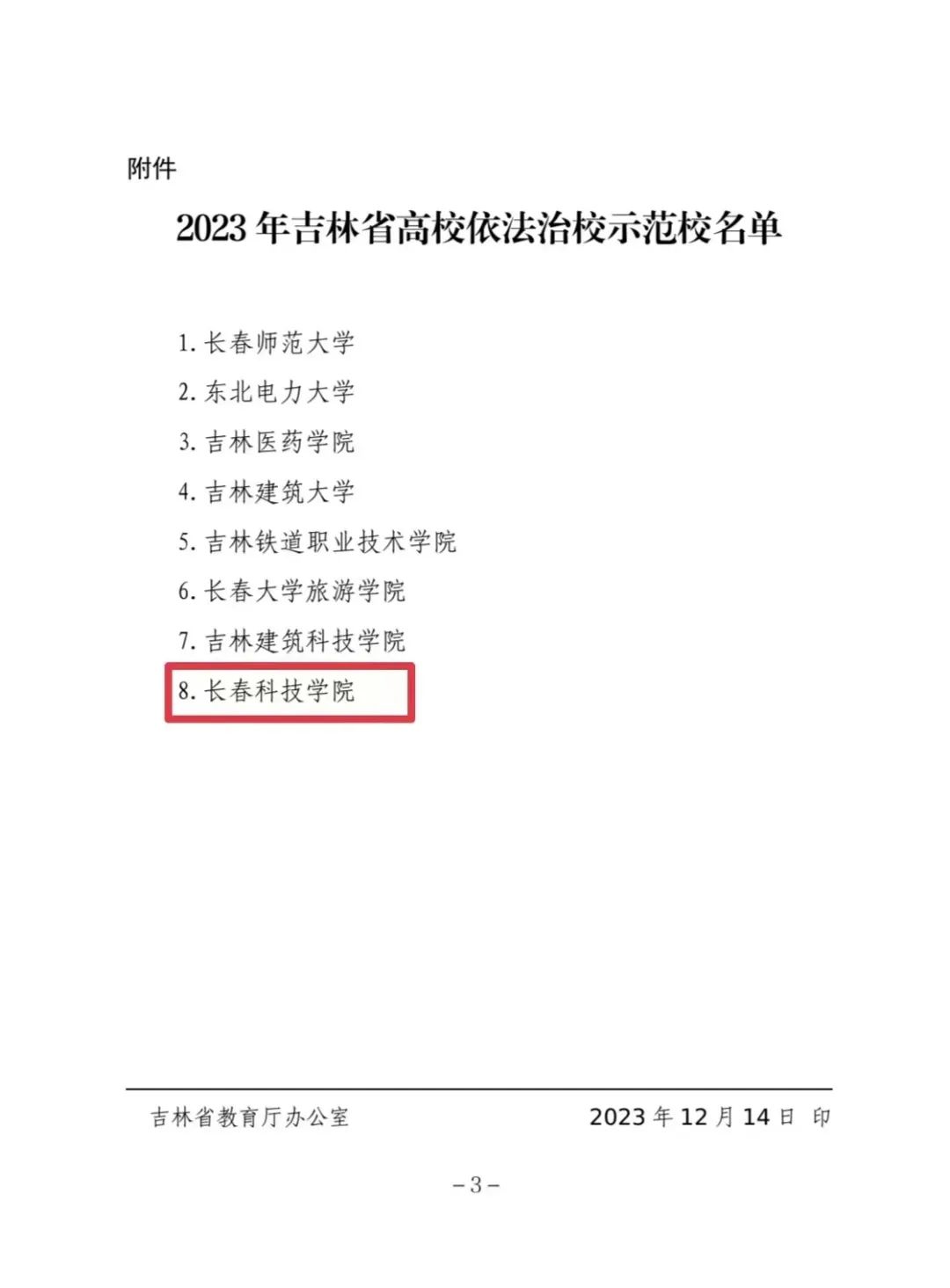 近日,由吉林省教育厅组织评选的“2023年吉林省高校依法治校示范校”评选结果揭晓,长春科技学院被评为“2023年吉林省高校依法治校示范校”荣誉称号,这是我校坚持法治理念、强化规范建设、提升治理水平的集中彰显和重大成果。