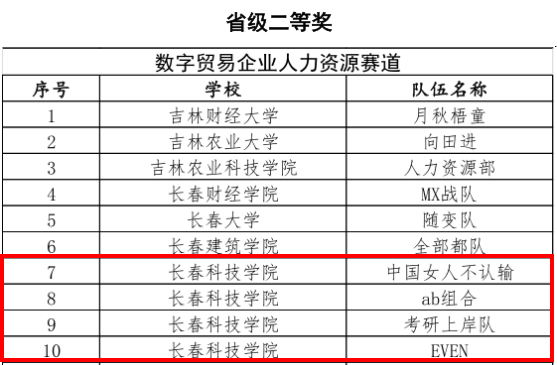 12月17日,由吉林省教育厅指导,长春光华学院主办的“敏学杯”第二届吉林省冰雪新丝路数字贸易创新创业大赛圆满结束。我校人力资源管理专业参赛队伍在企业人力资源赛道荣获一等奖一项,二等奖四项,三等奖一项。