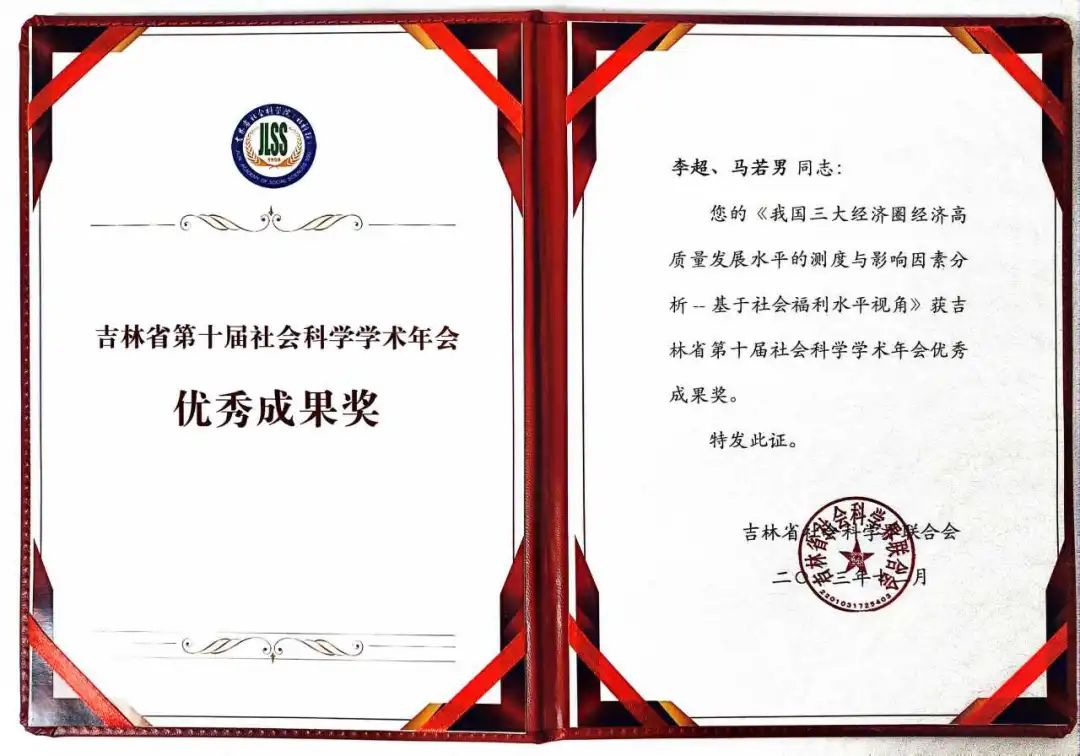会议对全省一年来各级、各类学术活动工作进行了全面回顾总结,并对全省社科联系统先进单位、个人和年会优秀学术成果、优秀组织单位进行表彰。经济与管理学院教师李超、马若男的论文《我国三大经济圈经济高质量发展水平的测度与影响因素分析——基于社会福利水平视角》获得吉林省第十届社会科学学术年会优秀成果奖。(通讯员:王美怡)