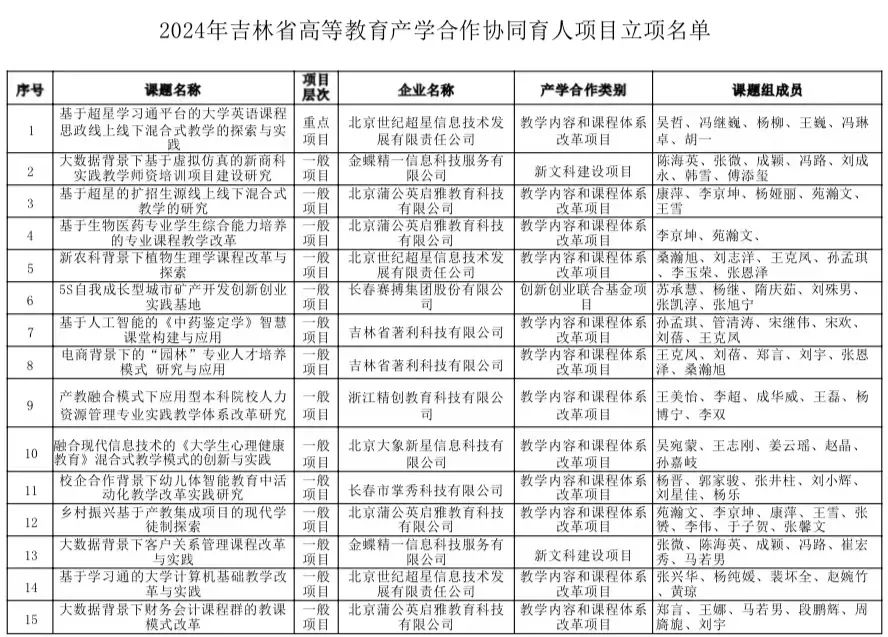 根据吉林省教育厅公布的《2024年吉林省本科高校校企合作协同育人项目拟立项名单》通知,我校共获批吉林省本科高校校企合作协同育人项目15项。是学校迄今为止,申报数量和立项数量最多的一次。