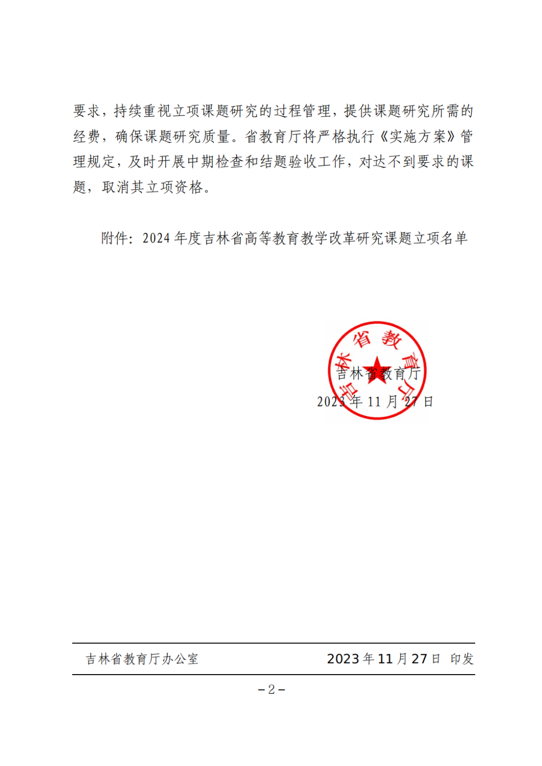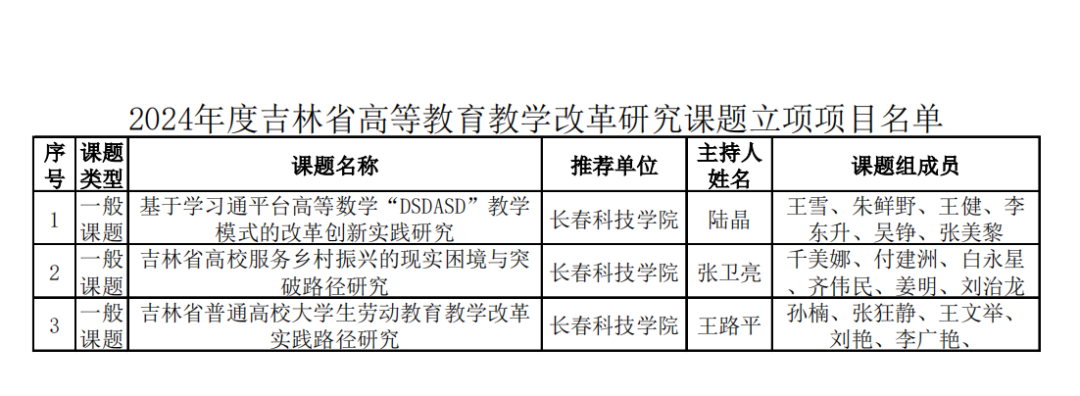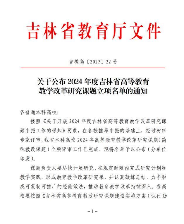 根据吉林省教育厅公布的《关于公布2024年度吉林省高等教育教学改革研究课题立项名单的通知》通知,学校共获批吉林省高等教育教学改革研究课题3项。