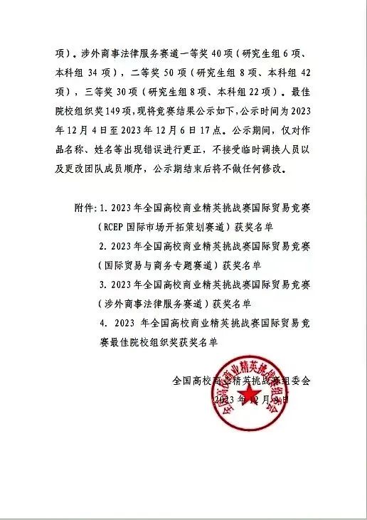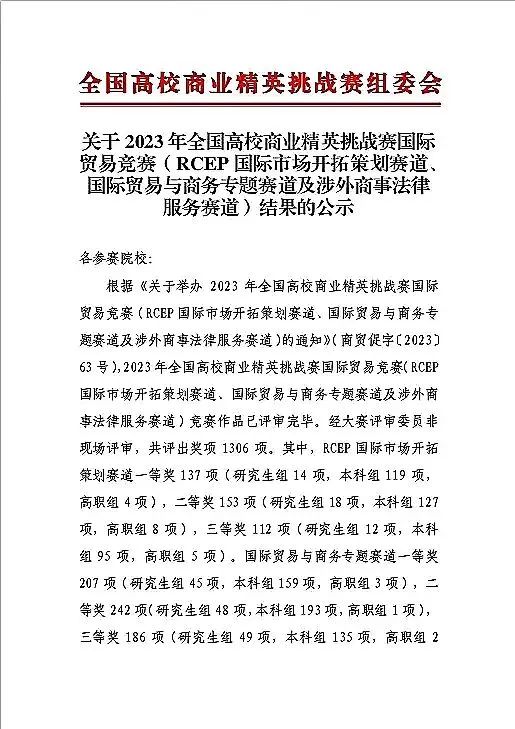 2023 年全国高校商业精英挑战赛国际贸易竞赛作品已评审完毕。经大赛评审委员非现场评审,共评出奖项1306项。其中国际贸易与商务专题赛道一等奖 207项(研究生组45项,本科组159项,高职组3项),二等奖242项(研究生组48项,本科组193项,高职组1项), 三等奖186项(研究生组49项,本科组135项,高职组2项)及最佳院校组织奖149项。