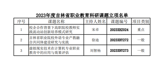 根据吉林省职业教育社公布的《关于2023年度吉林省职业教育科研立项课题评审结果的公示》通知,我校获批吉林省职业教育科研课题3项。其中,宋卓老师申报的《校企合作背景下高职院校教师实践流动站创新培养模式研究》立项为重点课题。