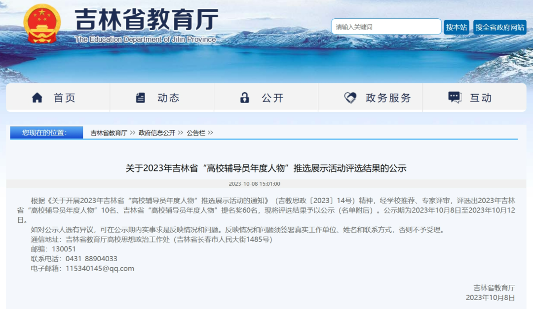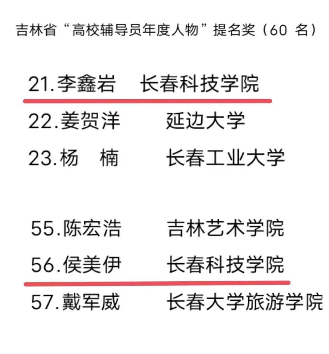 近日,吉林省教育厅网站公示了2023年吉林省“高校辅导员年度人物”推选展示活动评选结果。我校辅导员李鑫岩、侯美伊荣获2023年吉林省“高校辅导员年度人物”提名奖。