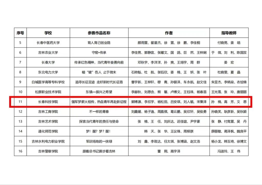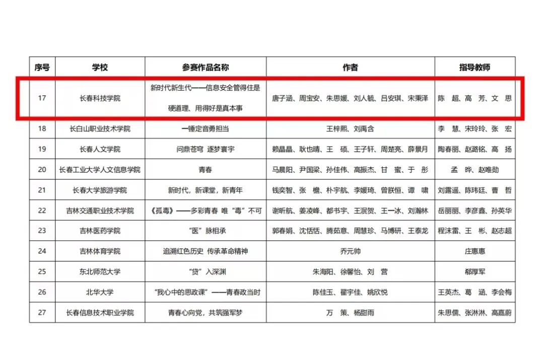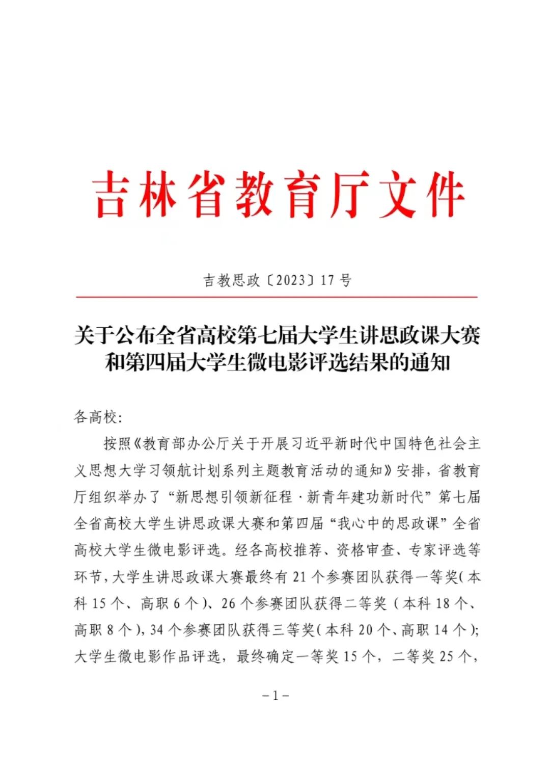 近日,根据吉林省教育厅《关于公布全省高校第七届大学生讲思政课大赛和第四届大学生微电影评选结果的通知》(吉教思政[2023]17号),在吉林省教育厅组织举办的第七届全省高校大学生讲思政课大赛和第四届全省高校大学生微电影评选活动落下帷幕,我校报送的微电影作品《强军梦薪火相传,热血青年再赴新征程》、《新时代新生代一一信息安全管得住是硬道理、用得好是真本事》喜获三等奖,并推荐到国家参赛。