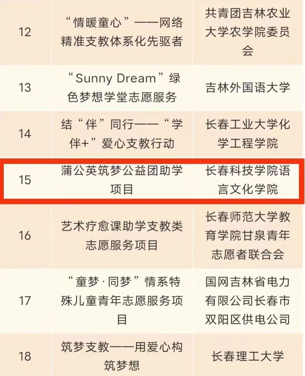 近日,“志愿长春,爱在社区”长春市青年志愿服务项目大赛圆满落幕。热烈庆祝语言文化学院·新媒体学院蒲公英筑梦公益团在“志愿长春,爱在社区”长春市青年志愿服务项目大赛中喜获佳绩!