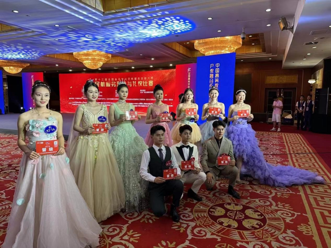 经过激励角逐,由民航行业专业评审,企业专业评审,最终航空服务艺术与管理专业翟玉峰(男,全国共12名)、刘铭霞、鹿玮同学荣获第十三届全国高等学校民航服务技能大赛“形象大使”称号,并参加全国高等学校民航形象大使展示表演。