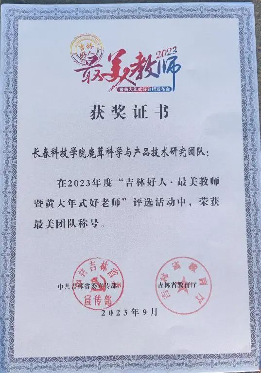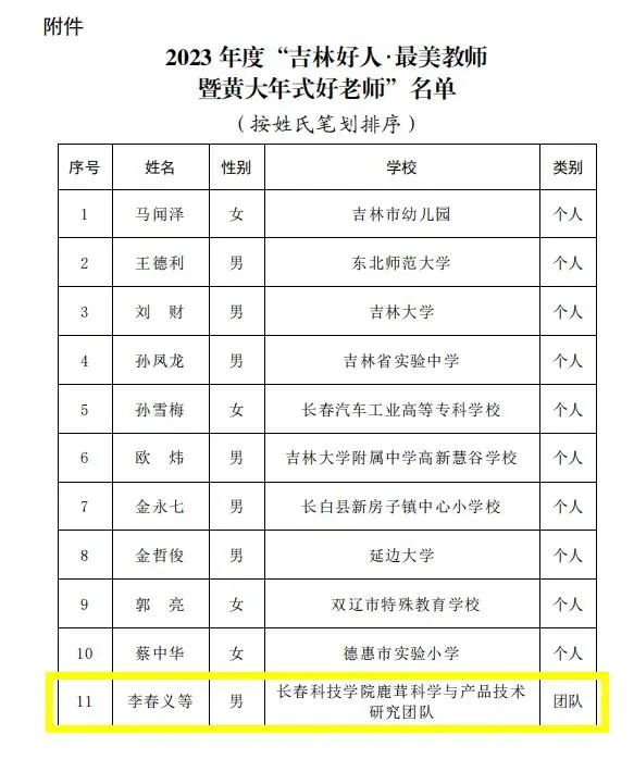 2023年8月16日,吉林省教育厅官发布2023年度“吉林好人•最美教师暨黄大年式好老师”的决定,我校李春义带领的鹿茸科学与产品技术研究团队光荣上榜。