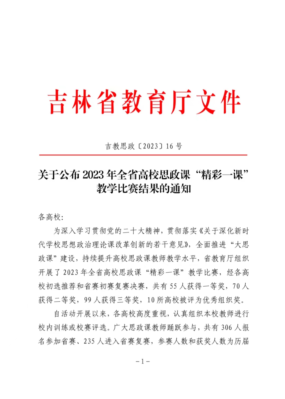 2023年全省高校思政课“精彩一课”教学比赛由省教育厅主办,是全省高校思政理论课教师展现风采、体现水平、切磋交流的重要平台。经过学校初选推荐和省赛、复赛、决赛,此次比赛总计306人报名参加省赛、235人进入省赛复赛,55人获得一等奖,70人获得二等奖,99人获得三等奖,10所高校被评为优秀组织奖。