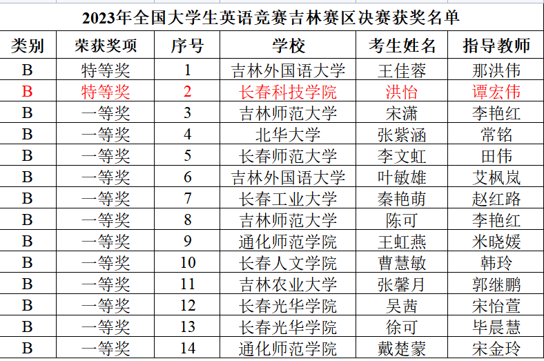 6月3日,2023年全国大学生英语竞赛决赛在长春理工大学举行,经过激烈的角逐,我校学子发挥出色,取得了优异的成绩。现将获奖名单公布如下: