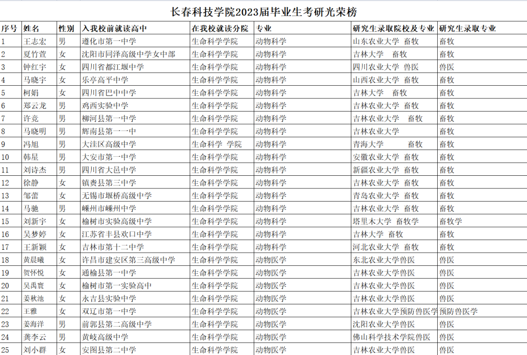 2023年,学校考研工作又上新台阶。2023届毕业生中共有163人考取硕士研究生,持续多年位列吉林省同类院校考研榜首。多名同学被吉林大学、东北师范大学、海南大学、四川农业大学、东北农业大学、延边大学等985、211知名高校录取。其中学校动物科学专业考研率达到77.27%,成为全校师生关注的热点。