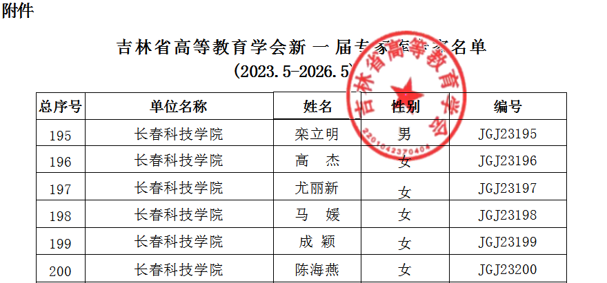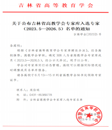 近日,吉林省高等教育学会发布了《关于公布吉林省高教学会专家库入选专家(2023.5一2026.5)名单的通知》(吉高学会[2023]5号),学校栾立明、高杰、尤丽新、马媛、成颖、陈海燕共6名专家入选吉林省高教学会专家库。