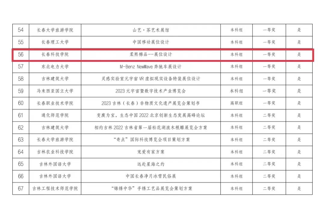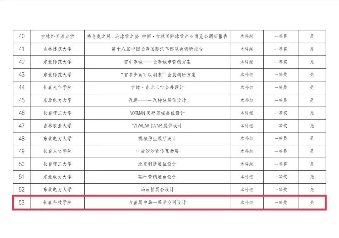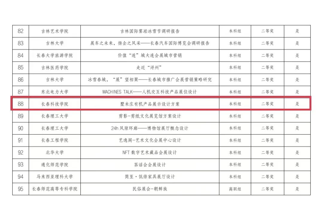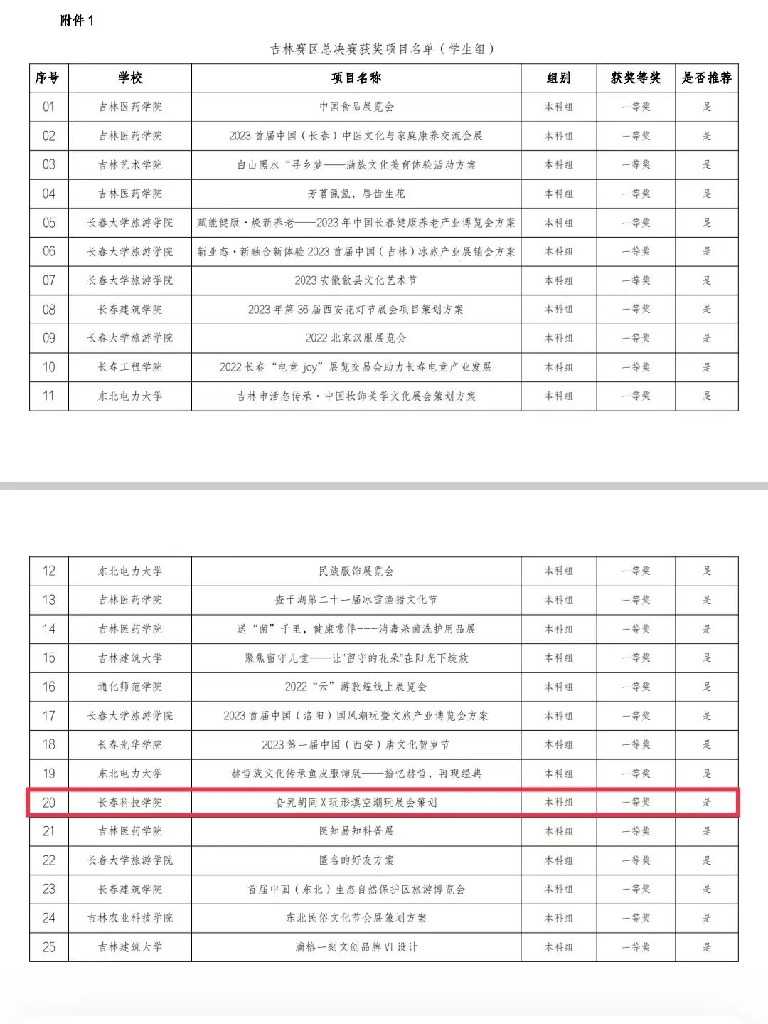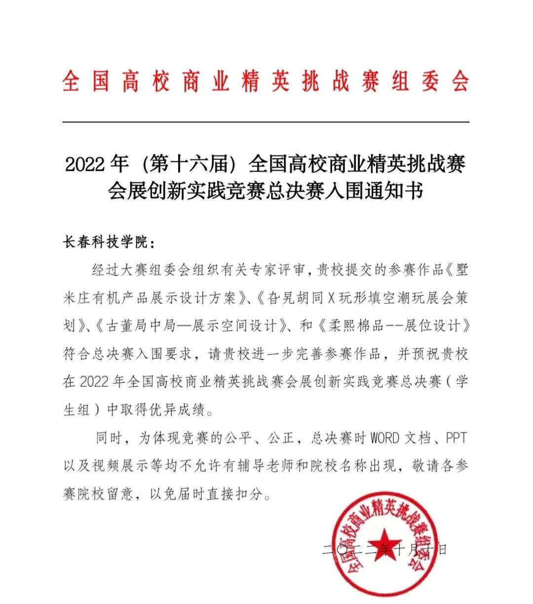 2022 年“卡戳杯”吉林省会展创新创业竞赛总决赛于2022年10月8日正式落幕,比赛结果在众多选手的紧张期待中得以公布。按照第十六届全国高校商业精英挑战赛会展专业创新创业实践竞赛吉林赛区大赛评审工作的有关规定,吉林赛区经过网络评审、线上答辩汇报评审,共产生“学生组”一等奖 60 个项目、二等奖 85 个项目。经过激烈角逐,学院学子取得瞩目的成绩。
