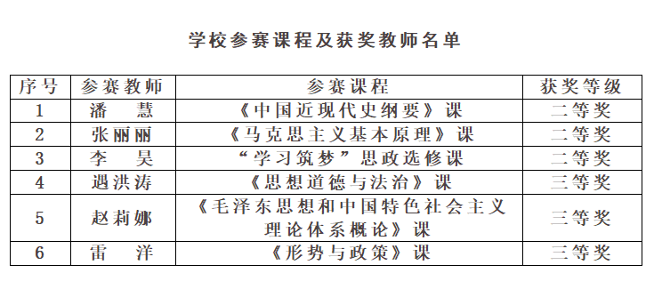 本次活动,学校领导高度重视,思政课教师参与热情高,上报材料质量高。在校内准备过程中,马克思主义学院全体教师群策群力,集思广益。遇洪涛院长逐个检查并亲自指导,参赛教师深入研究教学方法和教学理念,反复优化教学内容和教学设计。经过个人准备、校内遴选,最终推荐7名教师参加省级评选。
