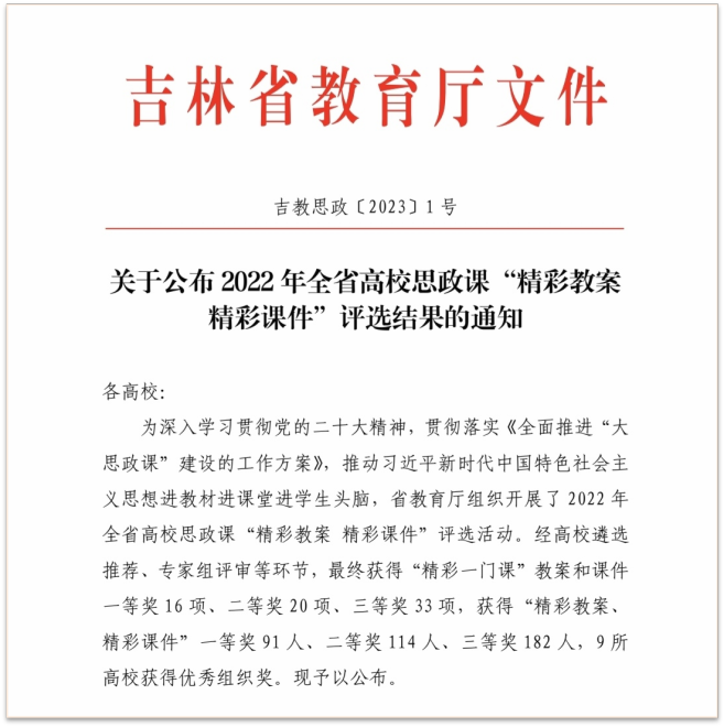 近日,吉林省教育厅组织的2022年全省高校思政课“精彩教案、精彩课件”评选结果揭晓,本科组中,学校马克思主义学院共有6名教师获奖,其中,二等奖3人,三等奖3人。