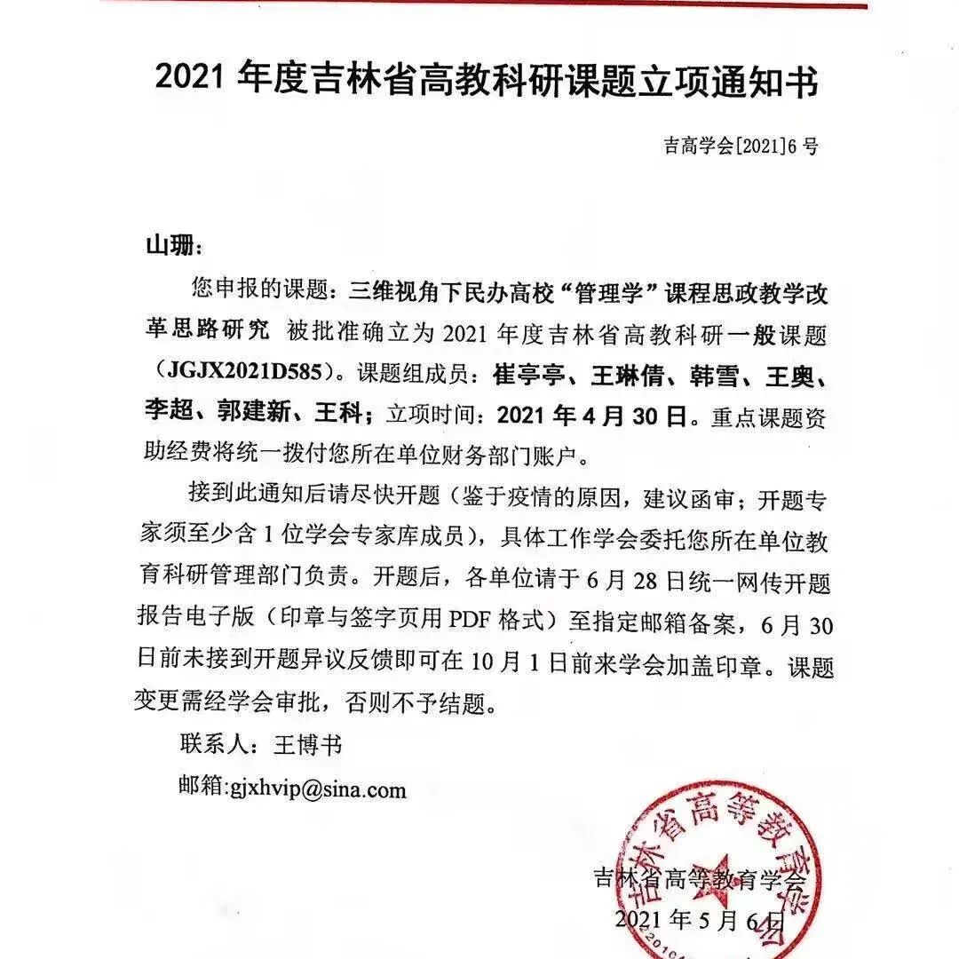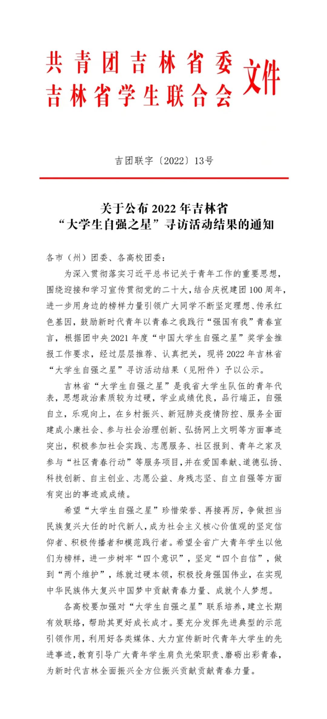近日,共青团吉林省委、吉林学生联合会下发关于公布2022年吉林省“大学生自强之星”寻访结果的通知,我校学生王钦、王科荣获“大学生自强之星”称号。