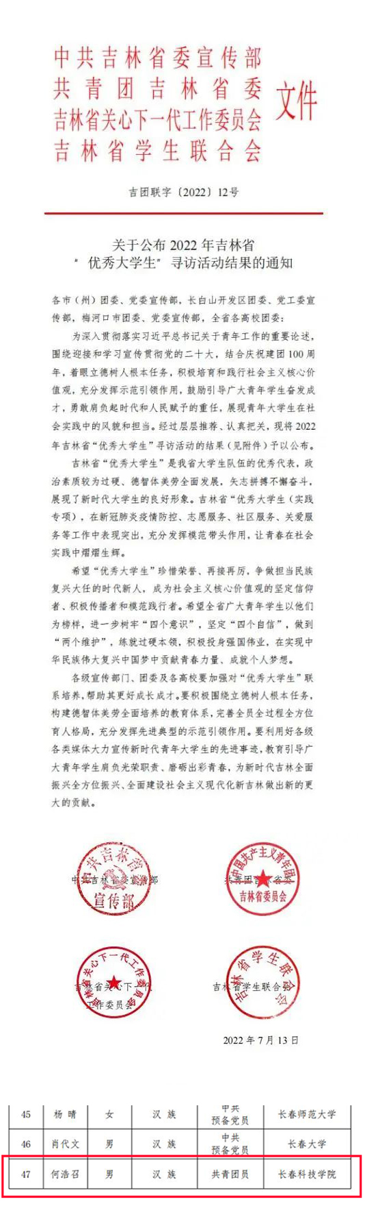 近日,由中共吉林省委宣传部、共青团吉林省委、吉林省关心下一代工作委员会以及吉林省学生联合会联合开展的2022年吉林“优秀大学生”寻访活动圆满结束,此次活动共选出2022年吉林省“优秀大学生”100名、“实践专项”50名。