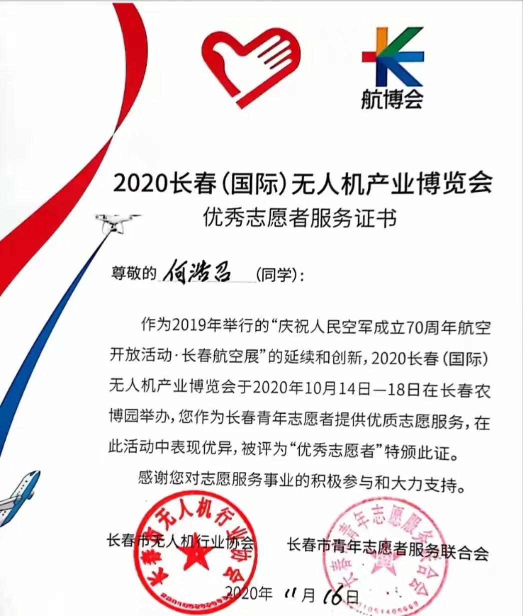 参加2020长春(国际)无人机产业博览会志愿活动并荣获优秀志愿者等。