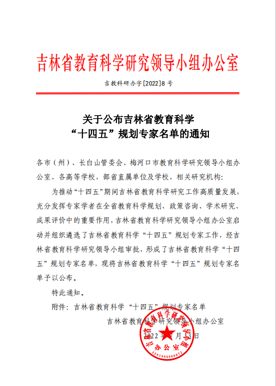 近日,吉林省教育科学研究领导小组办公室下发了《关于公布吉林省教育科学“十四五”规划专家名单的通知》(吉教科研办字[2022]8号),通知内容指出,为推动“十四五”期间吉林省教育科学研究工作高质量发展,吉林省教育科学研究领导小组办公室启动并组织遴选了吉林省教育科学“十四五”规划专家工作,经吉林省教育科学研究领导小组审批,形成了吉林省教育科学“十四五”规划专家名单。