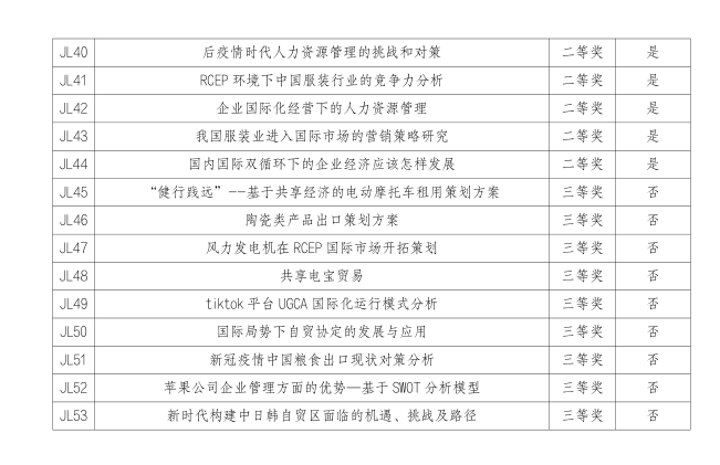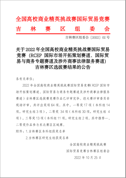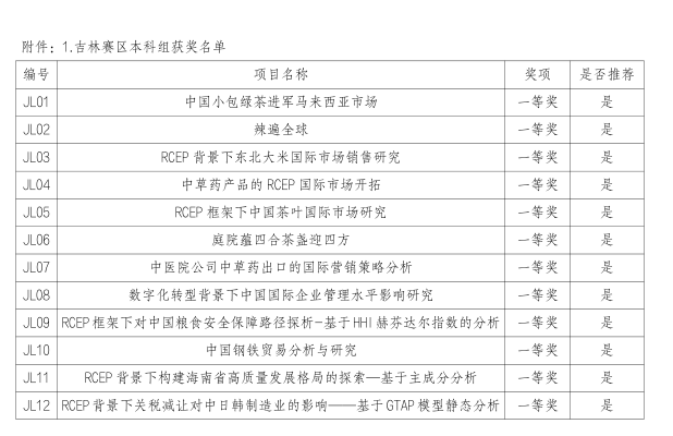 经济与管理学院国际经济与贸易专业王奥、滕德川老师带队指导的20级1班(王锦锦、刘玲玉、童睿樱、李佳蕊)4名同学参加的国际贸易与商务专题赛道喜获吉林省赛区一等奖。21级国贸1班(张婉婷、李梦娇、马晓静)3名同学参加的RCEP国际市场开拓策划赛道喜获吉林省赛区三等奖。