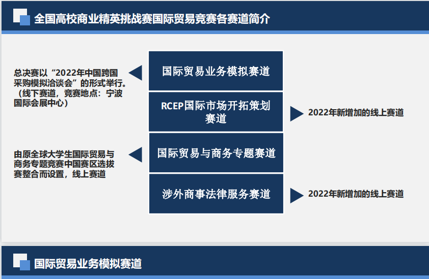 全国高校商业精英挑战赛国际贸易竞赛是由中国国际贸易促进委员会商业行业委员会(以下简称“中国贸促会商业行业委员会”)牵头主办,由渤海大学承办的国家级学科竞赛活动,该竞赛已纳入《2021全国普通高校大学生竞赛排行榜》。从2022年起,将原全球大学生国际贸易与商务专题竞赛中国赛区选拔赛纳入全国高校商业精英挑战赛国际贸易竞赛赛道,同时新增“RCEP国际市场开拓策划竞赛”和“涉外商事法律服务竞赛”赛道。