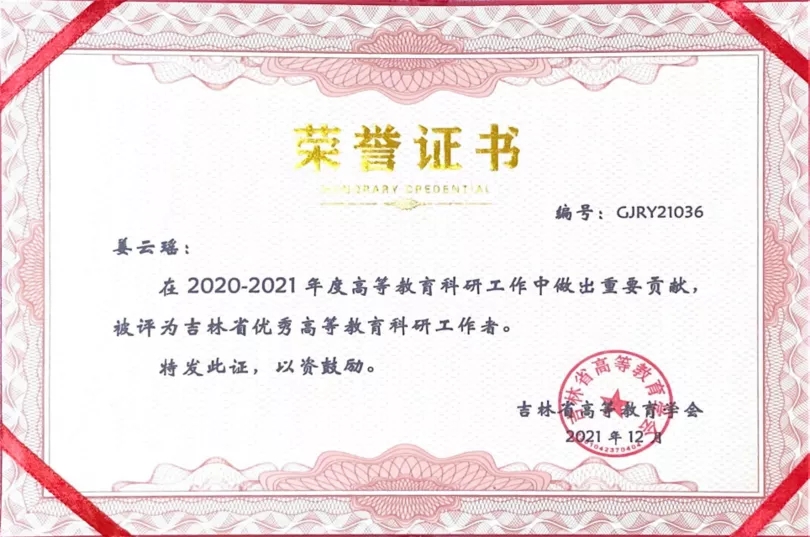 2022年1月14日,吉林省高等教育学会第八次会员代表大会暨2021年学术年会在吉林工程技术师范学院召开。长春科技学院荣获2020-2021年度高教科研工作先进单位,姜云瑶同志被评为吉林省优秀高教科研工作者。