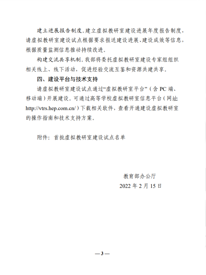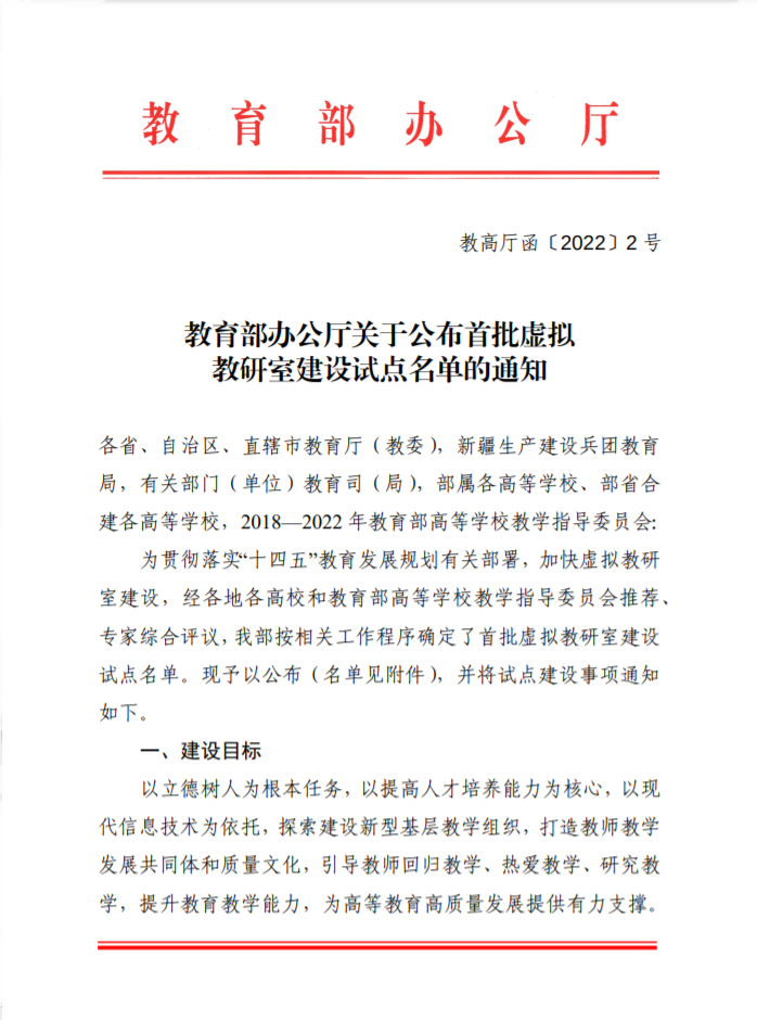 近日,教育部办公厅下发文件《教育部办公厅关于公布首批虚拟教研室建设试点名单的通知》(教高厅函【2022】2号)公布首批虚拟教研室建设试点名单。