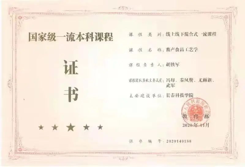 《畜产食品工艺学》是食品科学与工程专业、食品质量与安全的核心课程,是长春科技学院国家级本科线上线下混合一流课程,吉林省一流专业。教学团队由省级教学名师长科生命科学学院院长胡铁军和冯印、武军、秦凤贤、尤丽新4名具有高级职称的老师组成。