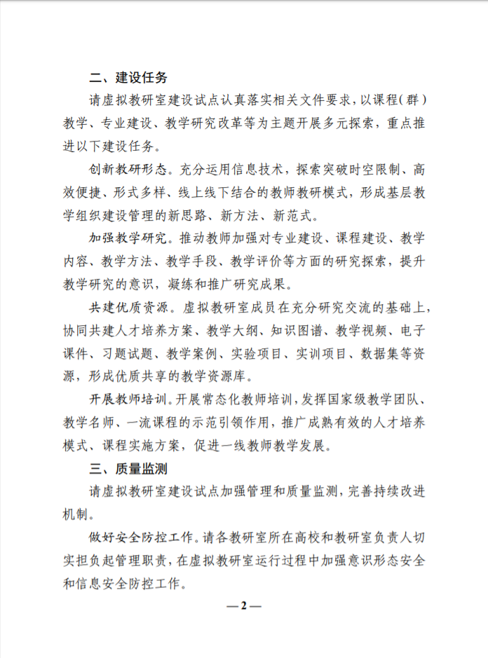 根据教育部文件要求,试点建设虚拟教研室均由教学名师、国家级一流专业负责人、一流课程负责人等高水平教师担任,依托“国际级一流专业建设点”或“一流课程”开展建设,涵盖四个方面建设任务:一是创新教研形态。充分运用信息技术,探索突破时空限制、高效便捷、形式多样、线上线下结合的教师教研模式,形成基层教学组织建设管理的新思路、新方法、新范式。二是加强教学研究。推动教师加强对专业建设、课程建设、教学内容、教学方法、教学手段、教学评价等方面的研究探索。三是共建优质资源。虚拟教研室成员协同共建人才培养方案、教学大纲、知识图谱、教学视频、电子课件、习题试题、教学案例、实验项目、实训项目、数据集等教学资源,形成优质共享的教学资源库。四是开展教师培训。开展常态化教师培训,发挥国家级教学团队、教学名师、一流课程的示范引领作用,推广成熟有效的人才培养模式、课程实施方案,促进一线教师教学发展。