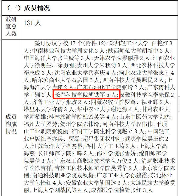 长春科技学院作为建设单位之一的“畜产食品工艺学虚拟教研室”名列其中。该教研室入选,为全国农业大学食品类唯一,四百多所食品类院校食品类仅4个。虚拟教研室分为三类:课程(群)教学类、专业建设类、教学研究改革专题类,首批439个虚拟教研室中,课程(群)教学类237个、专业建设类137个、教学研究改革专题类65个。