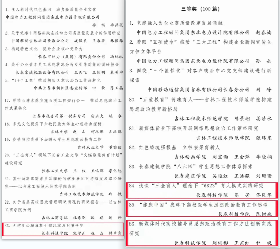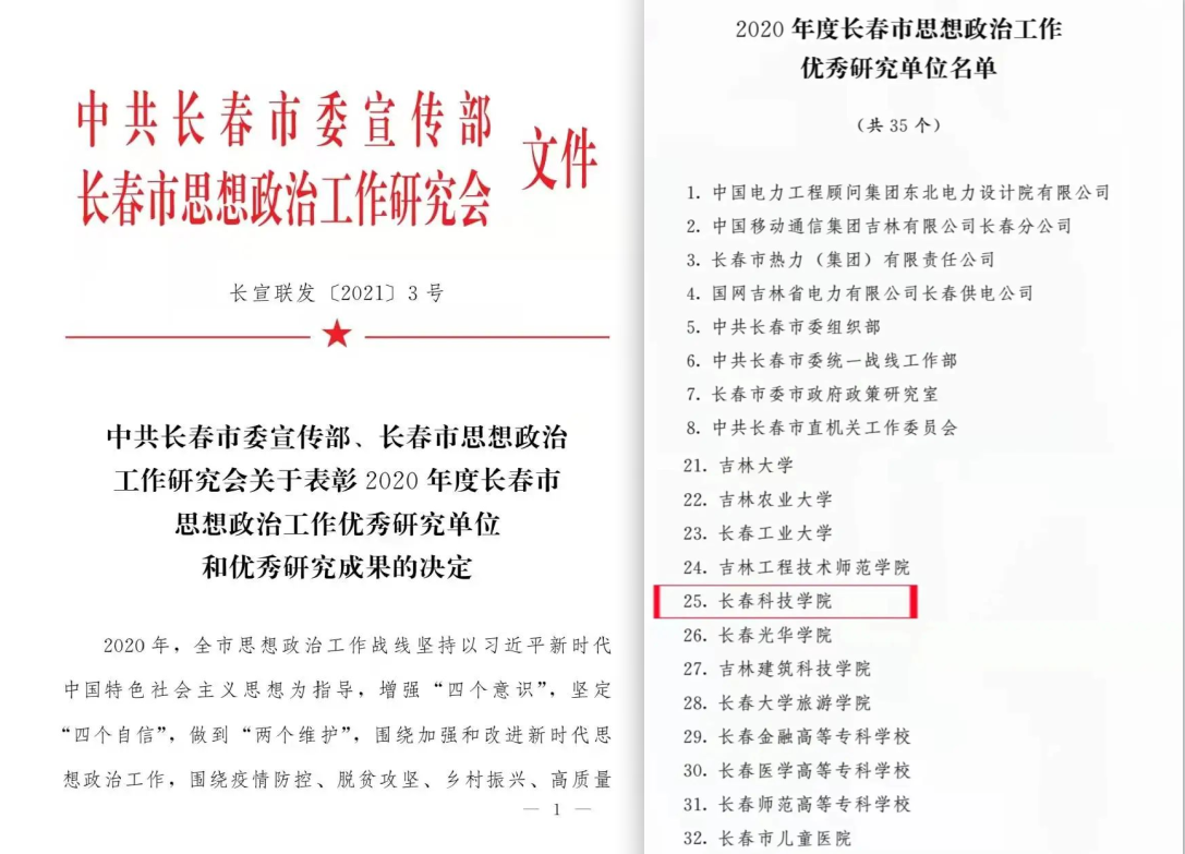 2021年11月23日,长春市委宣传部、长春市思想政治工作研究会联合下发了《关于表彰2020年度长春市思想政治工作优秀研究单位和优秀研究成果的决定》,长春科技学院被评为“2020年度长春市思想政治工作优秀研究单位”。宋学山、赵晶、韩卓育撰写的《大学生心理危机干预现状及对策研究》获优秀研究成果二等奖 ,高芳、佟风华撰写的《浅谈 “三全育人”理念下“6823”育人模式实践研究》,陈树森撰写的《“健康中国”战略下高校医学生思想政治教育工作思考》,周彬彬、王东红、杜锐撰写的《新媒体时代高校辅导员思想政治教育工作方法创新实践研究》获优秀研究成果三等奖。