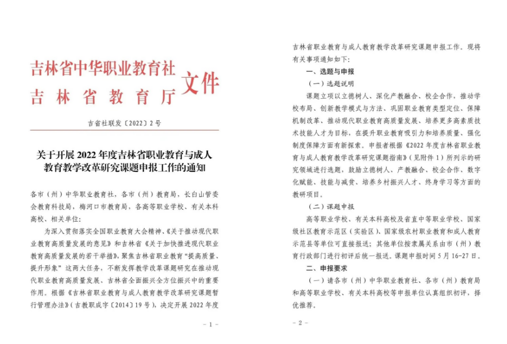为深入贯彻落实全国职业教育大会精神、《关于推动现代职业教育高质量发展的意见》和吉林省《关于加快推进现代职业教育高质量发展的若干举措》,聚焦吉林省职业教育“提高质量、提升形象”这两大任务,根据《关于申报2022年度吉林省职业教育科研课题的通知》,经分院(部)推荐申报、学校初审、专家评审、公告公示等阶段,学校共推荐6项优秀课题参与吉林省职业教育科研课题遴选。