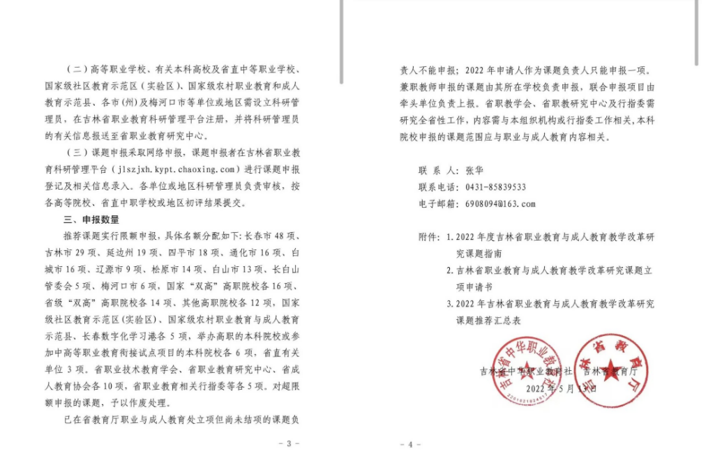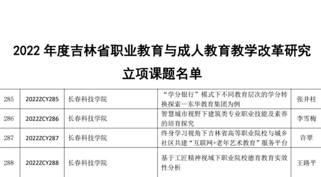 根据吉林省中华职业教育社、吉林省教育厅《关于开展 2022 年度吉林省职业教育与成人教育教学改革研究课题申报工作的通知》(吉省社联发〔2022〕2号)通知,学校“智慧城市视野下建筑类专业职业技能及素养的培育探究”、“基于工匠精神视域下职业院校德育教育实效性分析”等4项课题获得批准立项。