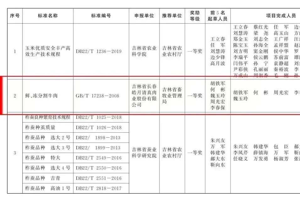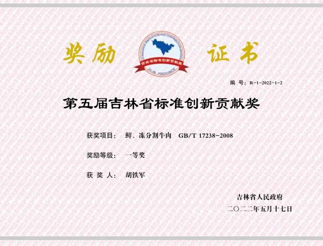 日前,长春科技学院传来喜讯,由长春科技学院生命科学学院院长胡铁军牵头编写的《鲜、冻分割牛肉标准》(编号GB/T 17238-2008)获“第五届吉林省标准创新贡献奖”一等奖。此次评选共有99个参评项目通过形式审查,评选出奖励项目30个,一等奖五项。