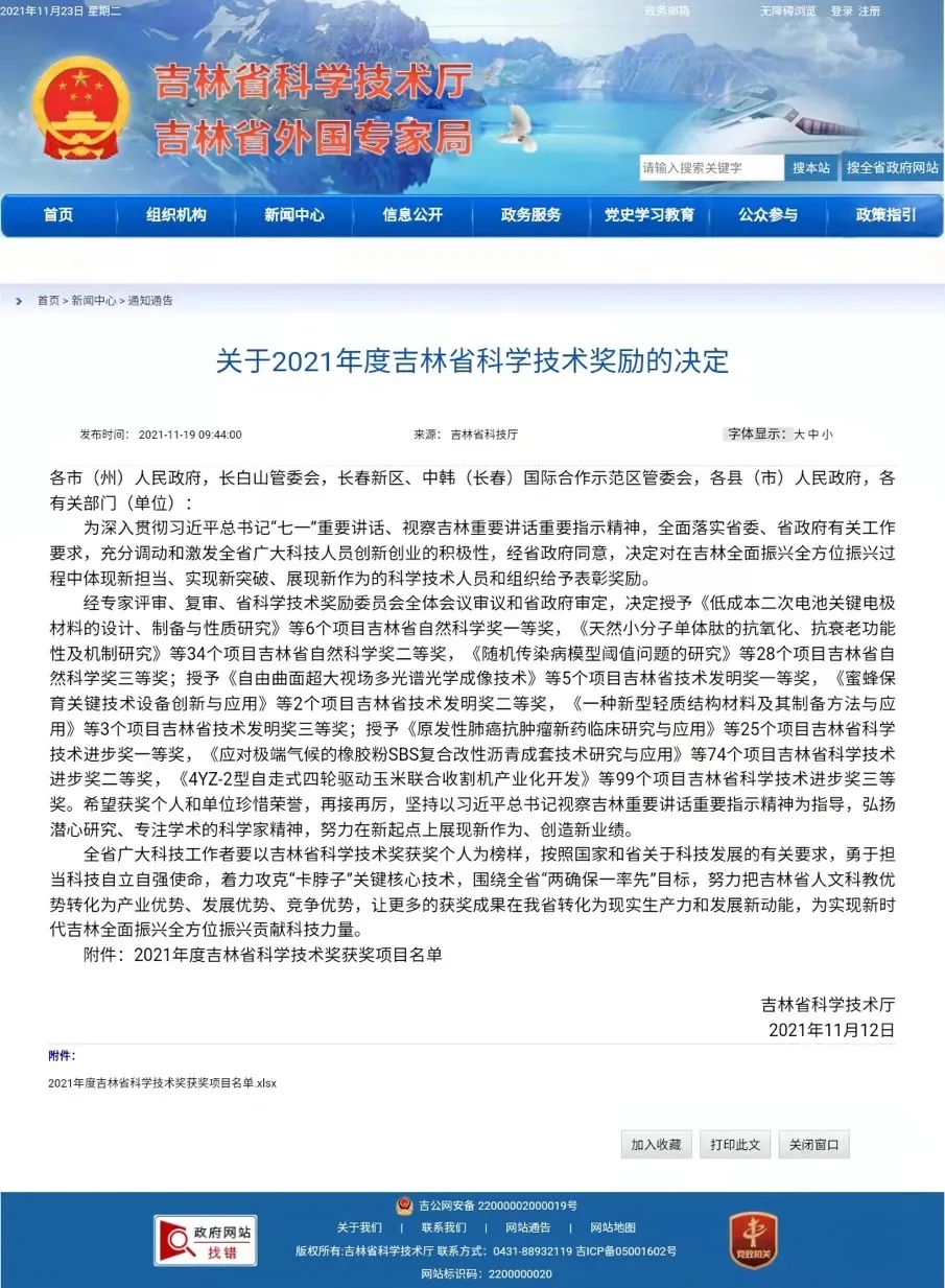 据悉,吉林省科学技术奖是省人民政府设立的省内科学技术领域最高奖项,旨在调动全省科学技术工作者的积极性和创造性,奖励科技创新活动中做出突出贡献的个人及组织,推动科学技术进步。2021年度吉林省科学技术奖共评出一等奖36项,二等奖110项,三等奖130项。