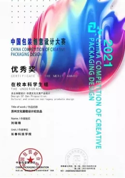 教师党员常丹在中国包装联合会举办的2021年度“中国包装创意设计大赛”中带领我院学生刘晓轶参赛作品《苏州文化屋檐设计纪念品》荣获优秀奖。常丹老师并荣获“优秀指导教师”称号。