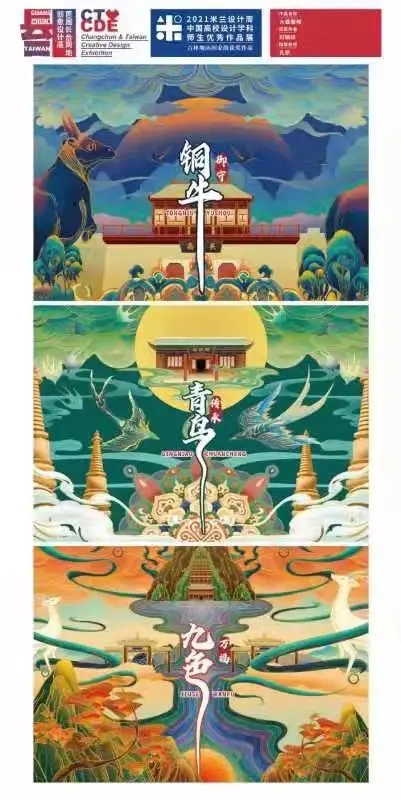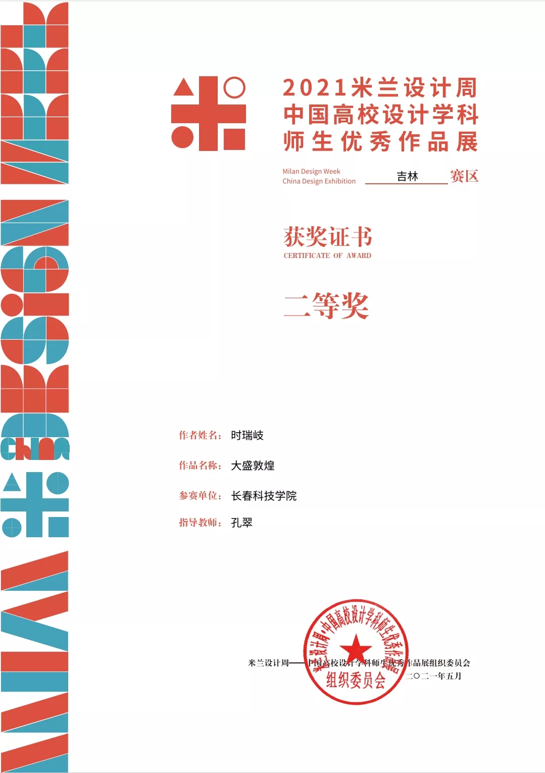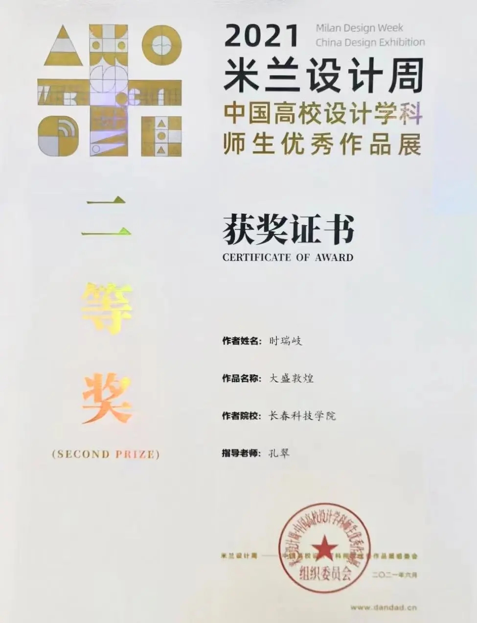 近日,“2021米兰设计周--中国高校设计学科师生优秀作品展”获奖作品名单公布,我校视觉艺术学院17级视觉传达平面设计1班时瑞岐同学创作的《大盛敦煌》在孔翠老师的指导下,获得了本次作品展的二等奖。