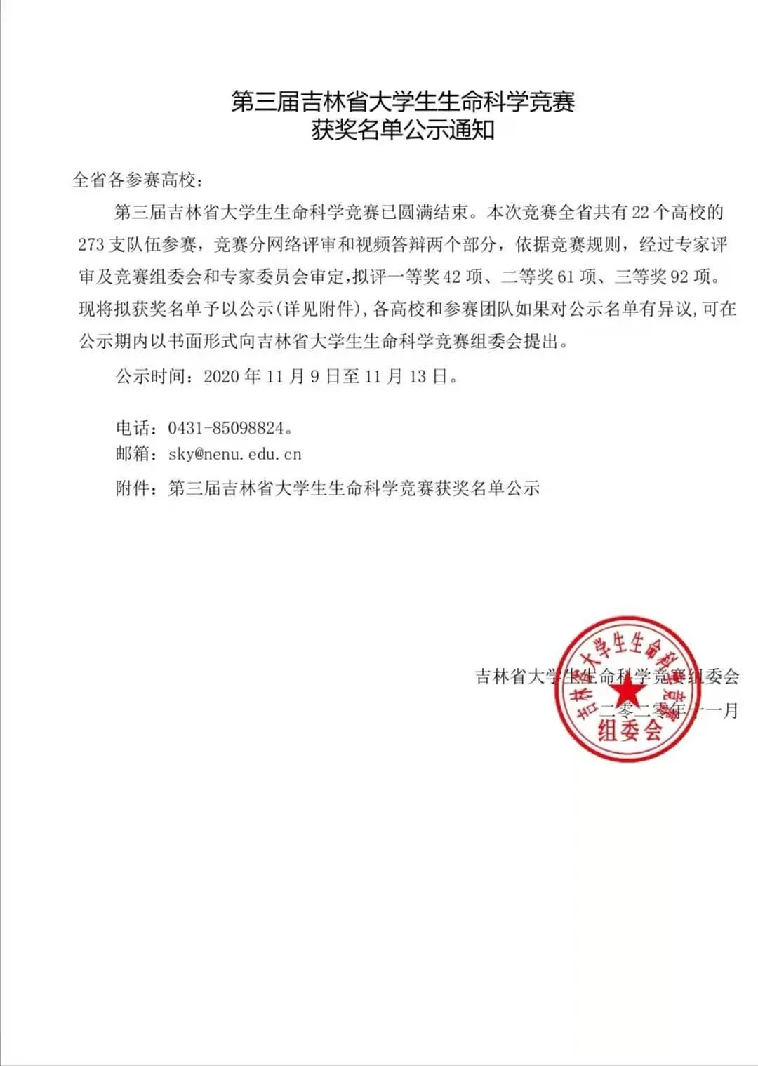 2020年11月8日,第三届吉林省大学生生命科学竞赛在东北师范大学圆满落下帷幕。本次比赛共有四支来自生命科学学院的团队参赛。经过激烈角逐,四支队伍均入围决赛,并斩获一等奖3项,二等奖1项。