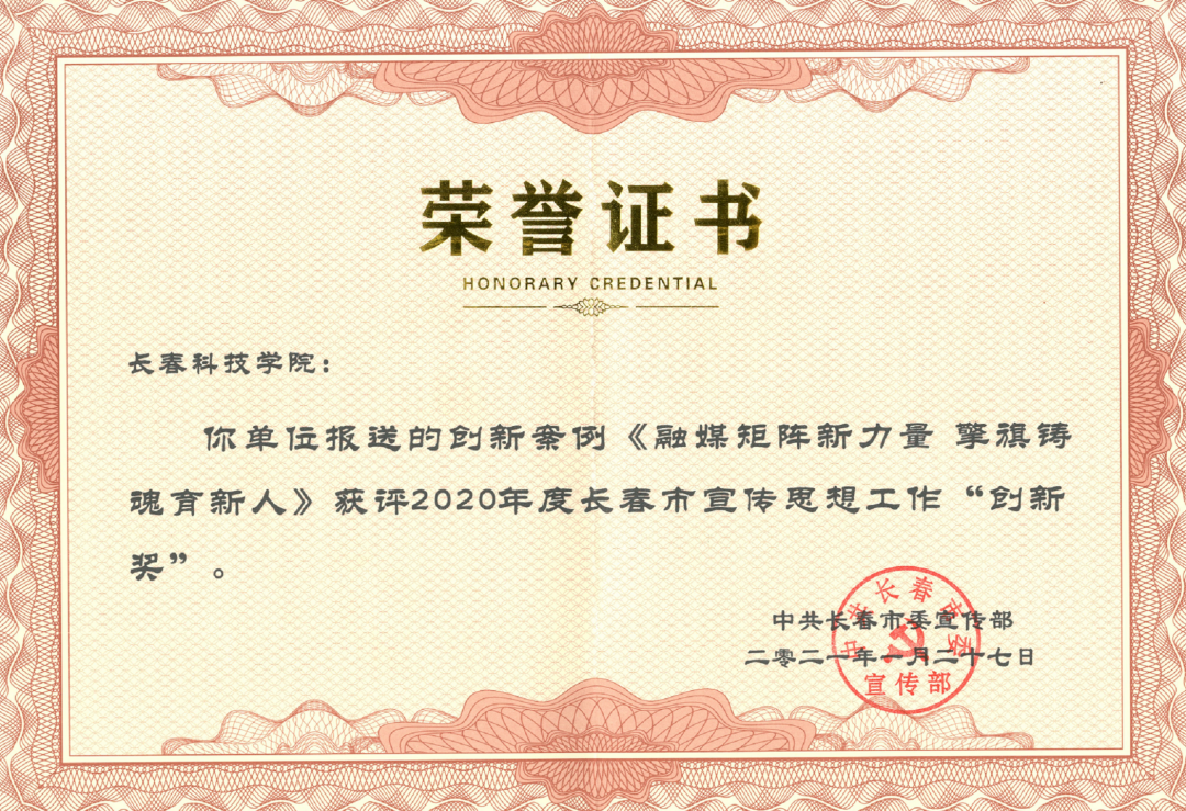 日前,中共长春市委宣传部公布了2020年度长春市宣传思想工作“创新奖”获奖项目名单,我校报送的创新案例《融媒矩阵新力量,擎旗铸魂育新人》名列榜单,荣获“创新奖”殊荣。