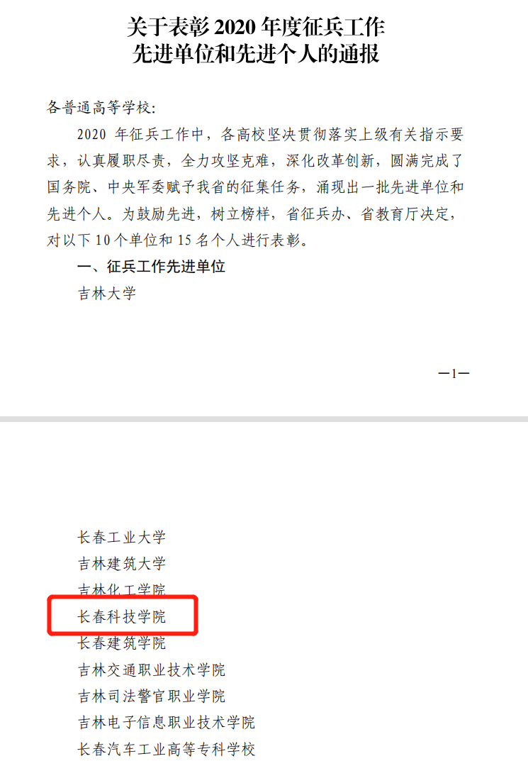 近日,吉林省教育厅、吉林省人民政府征兵办公室联合下发《关于表彰2020年度征兵工作先进单位和先进个人的通报》(吉征联[2021]2号),我校荣获2020年度“吉林省高校征兵工作先进单位”称号。